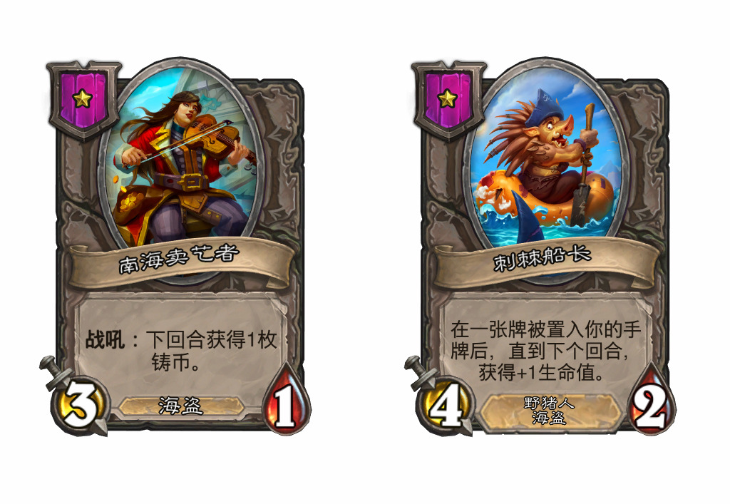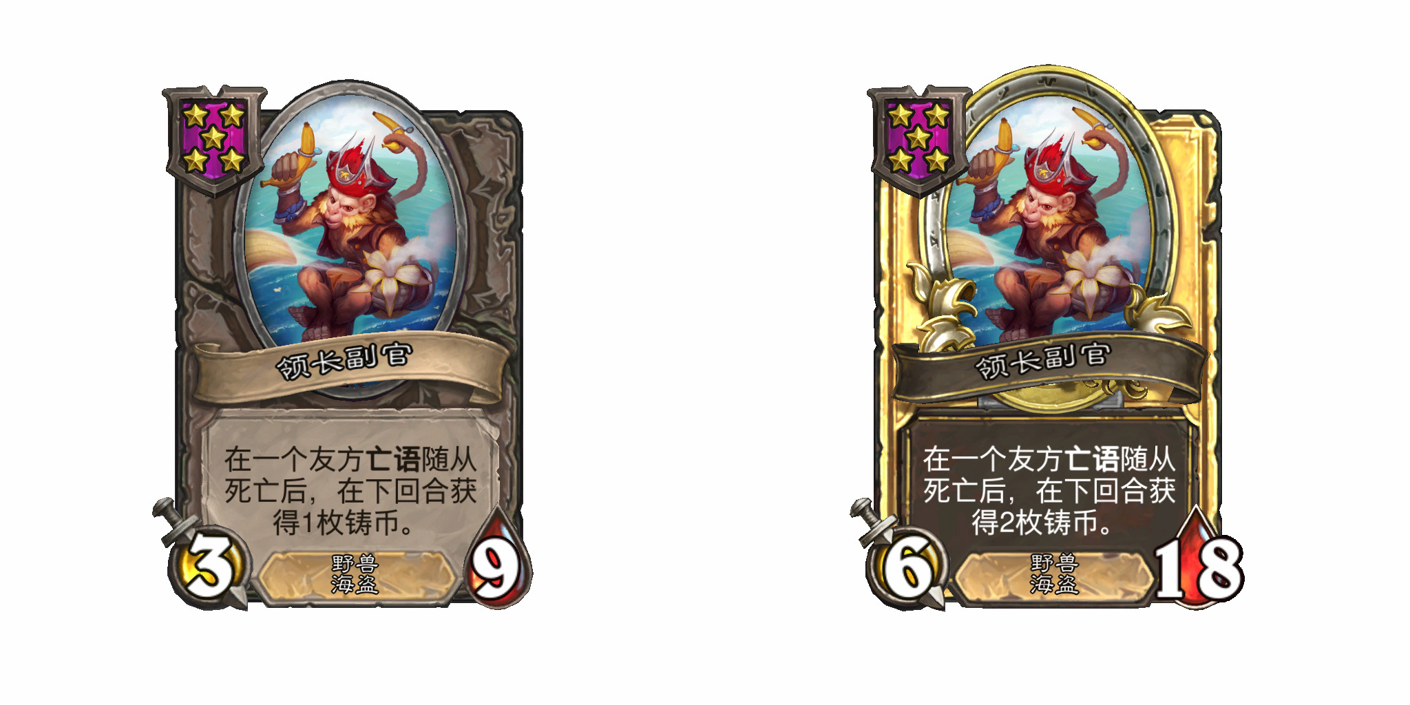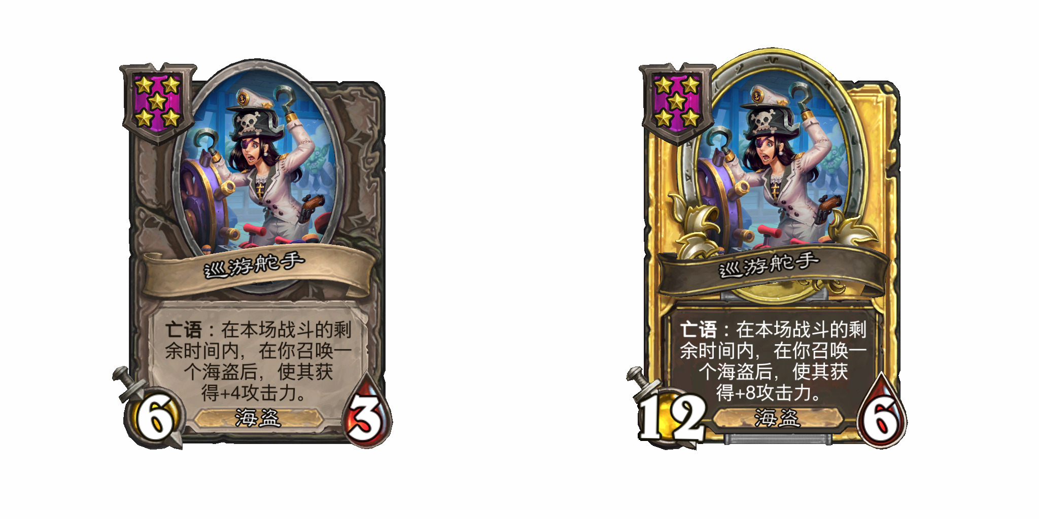 - 5星6/3海盗,亡语:在本场战斗的剩余时间内,在你召唤一个海盗后,使其获得+4攻击力。