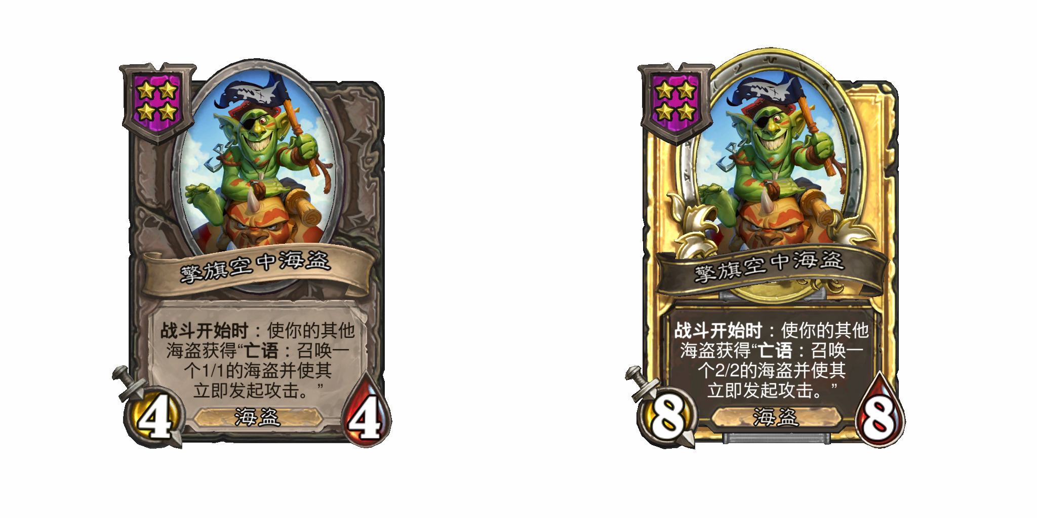 - 4星4/4海盗,战斗开始时:使你的其他海盗获得“亡语:召唤一个1/1的海盗并使其立即发起攻击”。