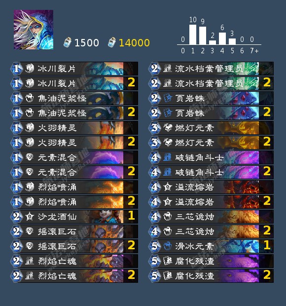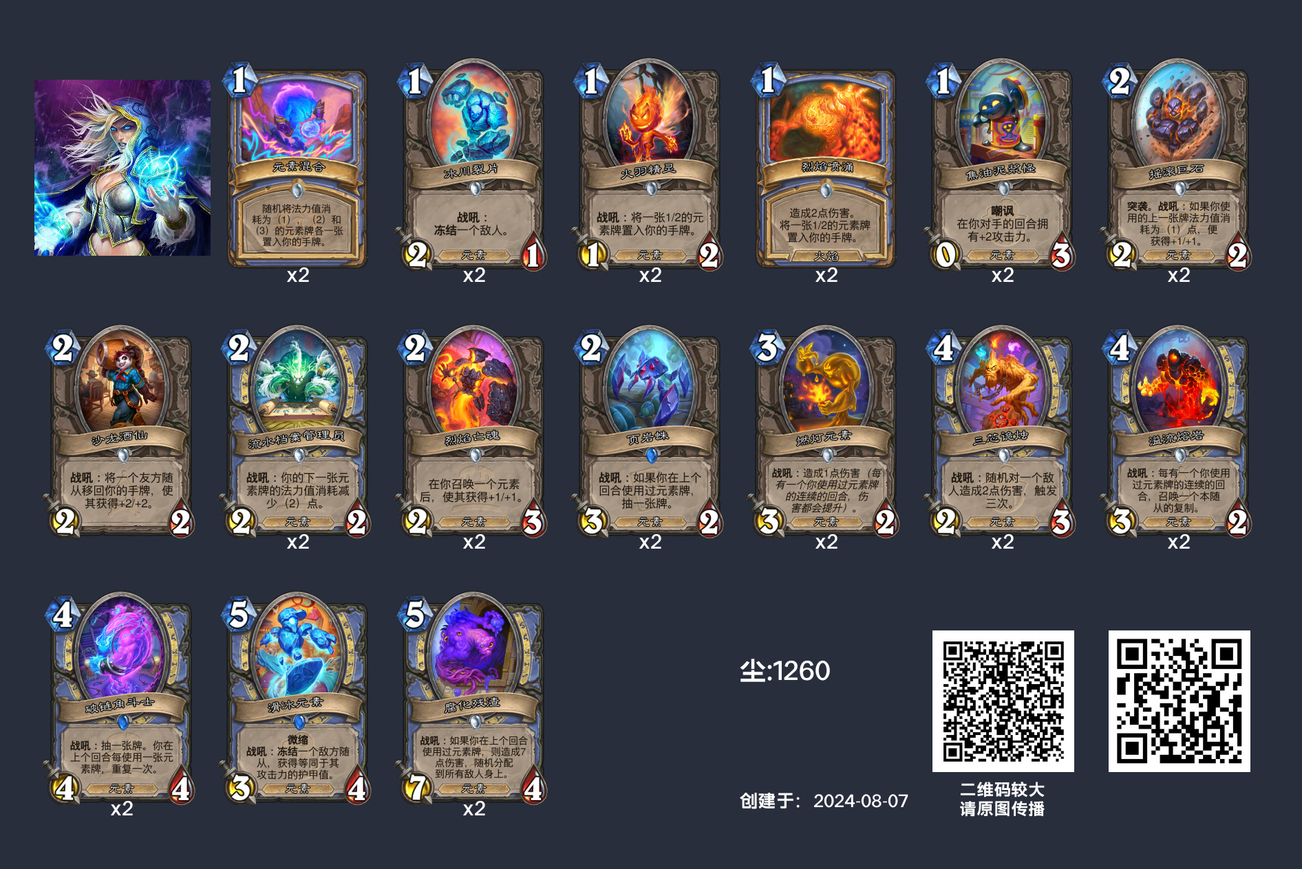 翻遍全网,没有元素法的攻略,于是边摸索边打,属实吃了不少亏。什么我上回合忘记上元素了?什么横扫只要三费了?什么闪电风暴稳定打三了?什么现在到传说要升50个段位??(为什么白金局对手加我好友显示他是传说?炉石也改成隐藏分匹配了?)……一边被炉石的变化瞳孔震惊,一边越打越顺手,50个段位不知不觉也越来越多连胜,对手的牌还没认全上了传说122名,再打几局又到了39名。在此向没有尘的新玩家、回坑玩家郑重推荐——蓝白元素法,造价只有一千尘,打完学徒模式就可以完全拥有的一套强度不俗的卡组!甚至只用知道对手的几张关键牌,其他都不用知道,学习成本极低!