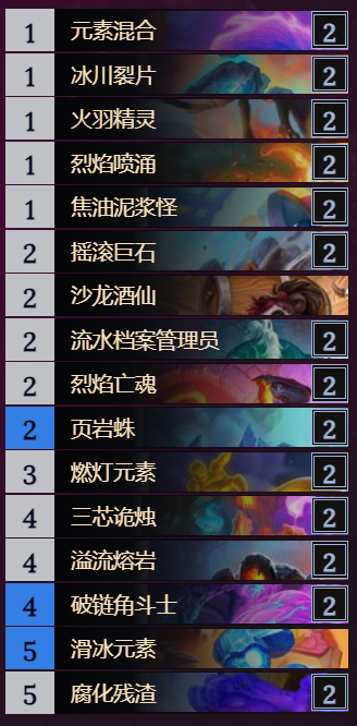 留牌思路:尽量找到一费元素随从,从一费开始连续下元素。