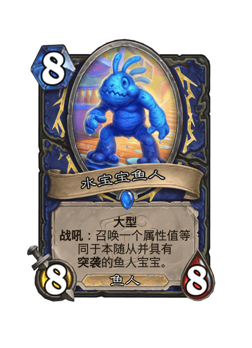 对手打出了枪手库尔特鲁斯,它的战吼打残了我们的水宝宝鱼人,但是我们水宝宝鱼人的战吼 依旧可以召唤出8/8的衍生物,这个bug已经被设计师标记,下个版本应该会修复