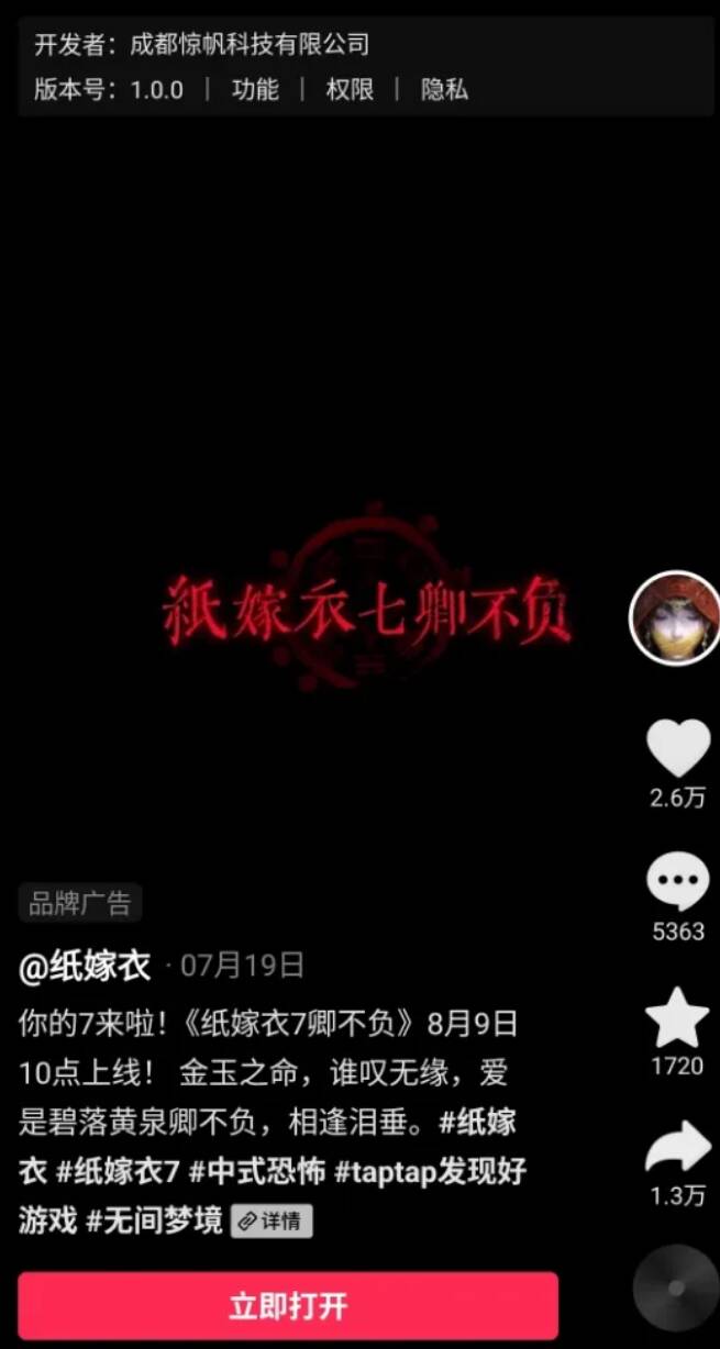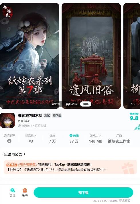 除抖音之外的平台,TAPTAP啥的,目前《纸嫁衣7》仍只是预约状态,根本不能下载。相当于抖音抢跑了两步。