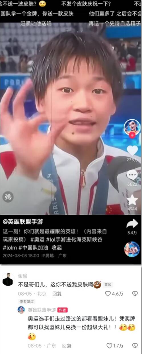 最后,前面都是游戏官方去贴奥运冠军,男子10米气手枪冠军谢俞则趁着《英雄联盟手游》发加油视频时,主动出击。