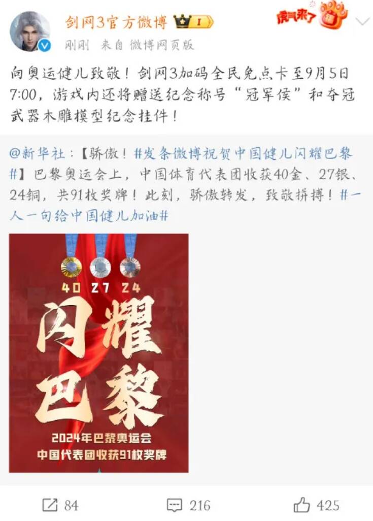 《剑网三》官博也转发了这次采访,并在后续表示为全体玩家奉上福利。