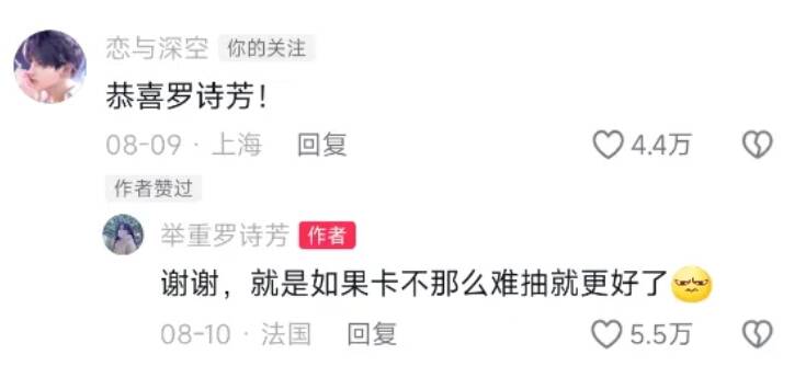 这自然引起了《恋与深空》官方的关注,于是在罗诗芳的抖音底下,《恋与深空》和罗诗芳发生了以下的对话。