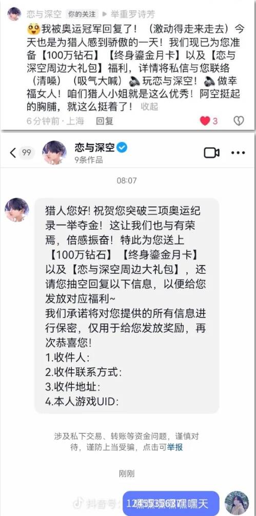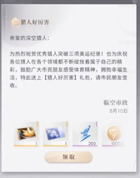 正当别的猎人都有些眼红,恨自己为什么不是那个奥运冠军的时候,《恋与深空》官方给各位玩家在游戏里发了一封邮件。