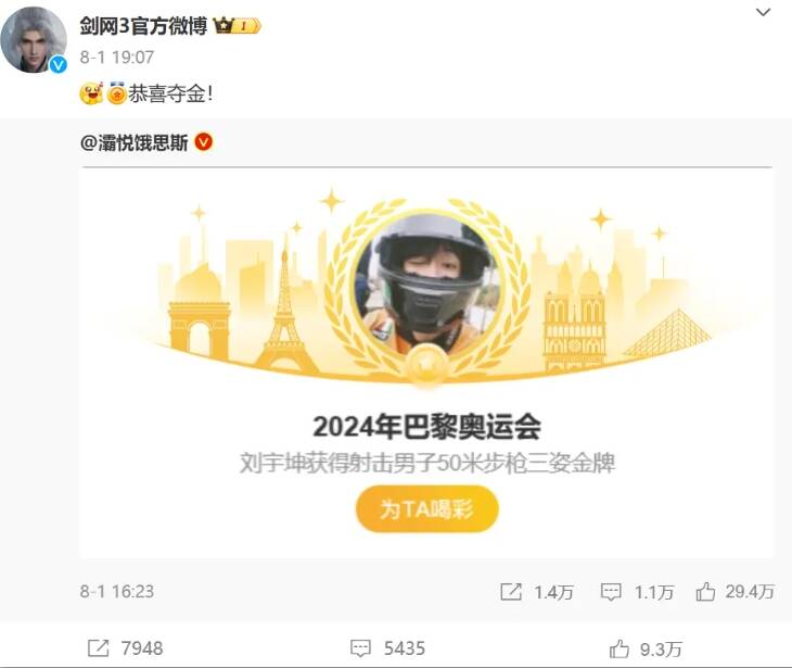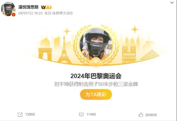 8月1日,在射击男子50米步枪三姿比赛中,中国选手刘宇坤获得了金牌,他的微博很快被微博官方直接“出道”。