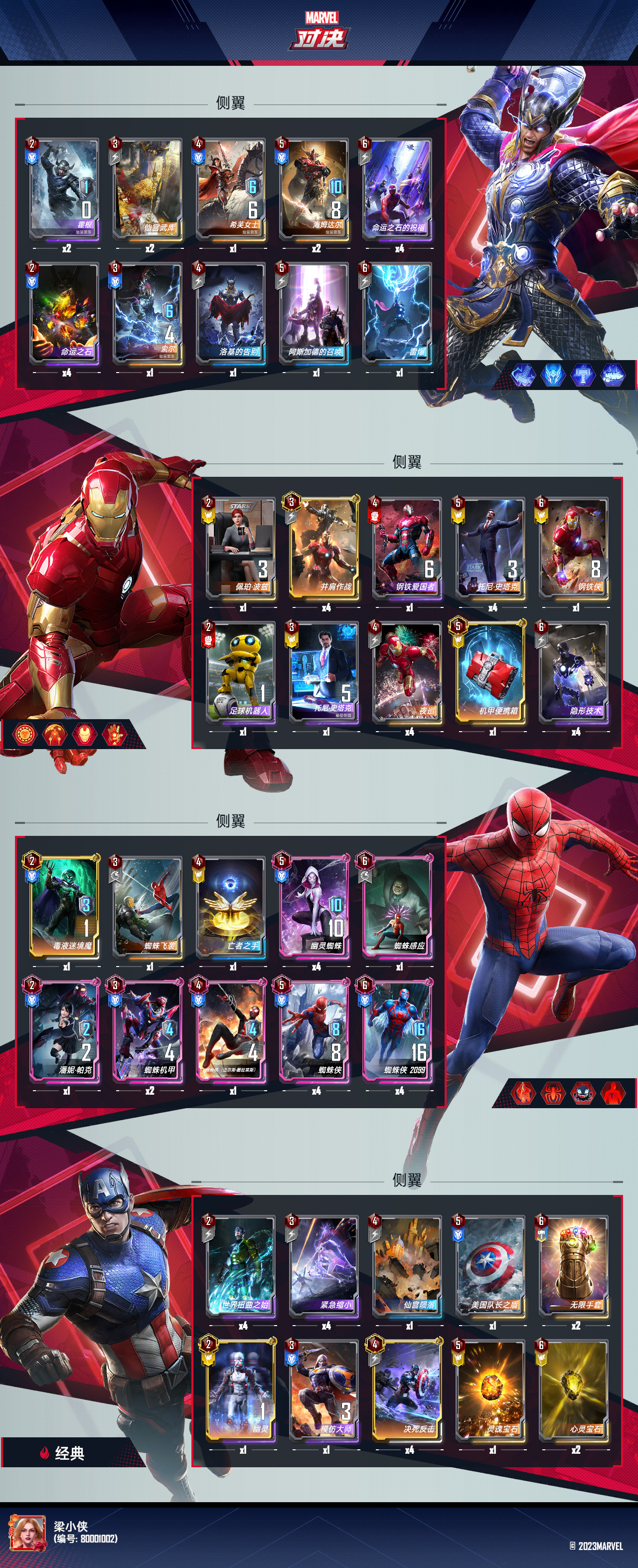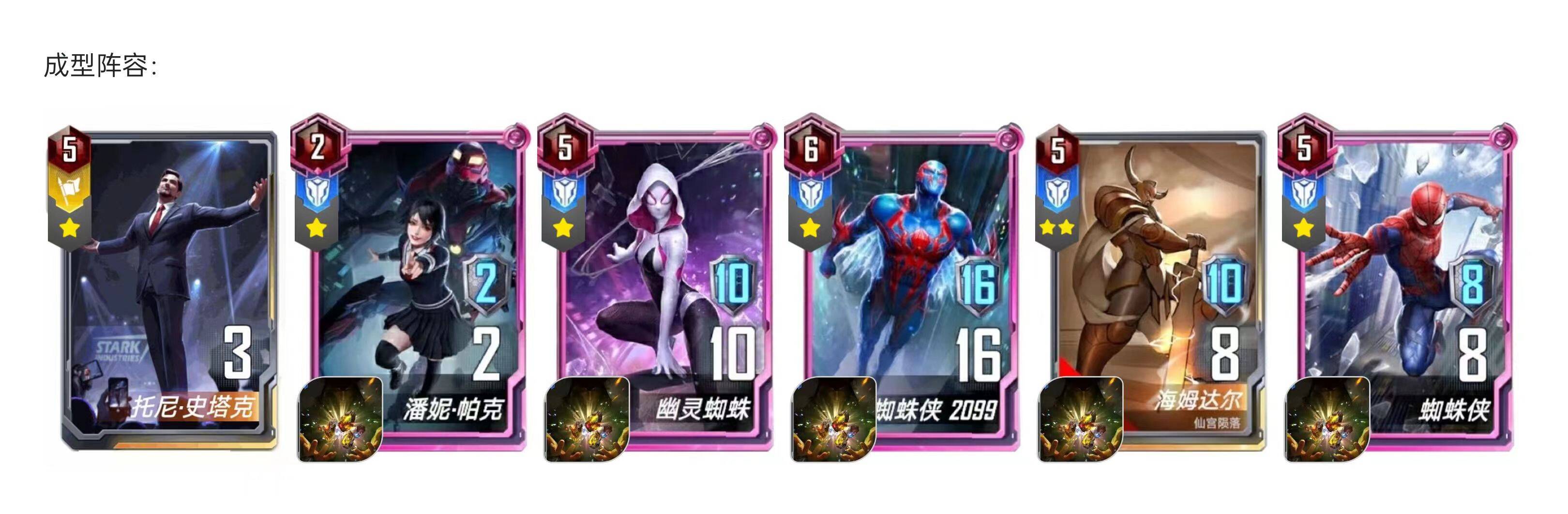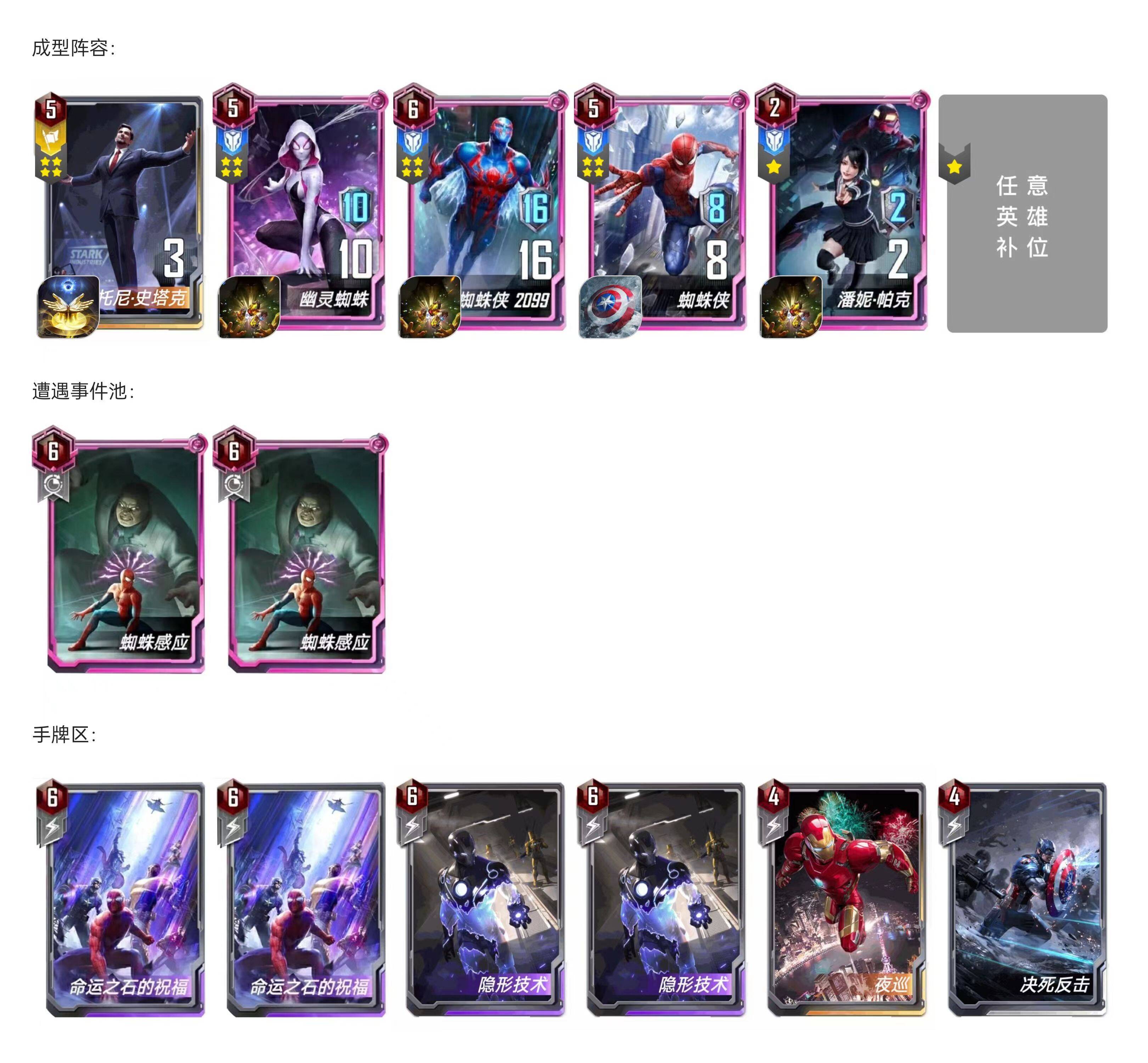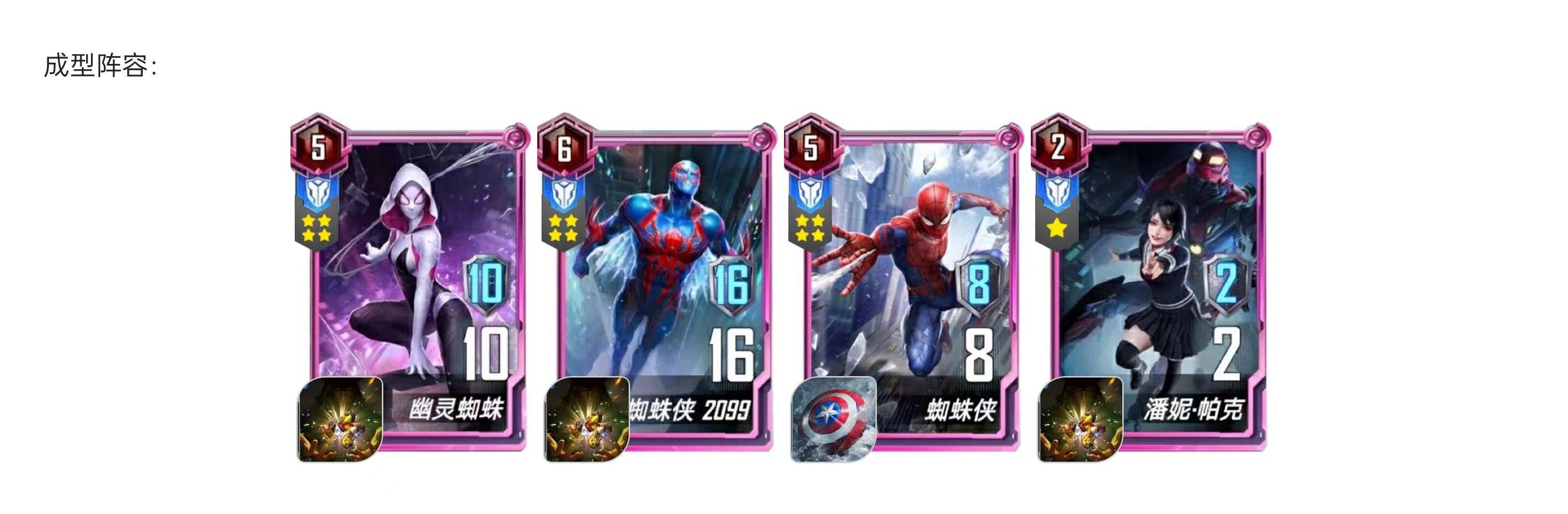 (解释:低配版就是侧翼4人组都是1张够用,只要后期通过界格温→界2099→界蜘蛛侠带盾→界潘妮,这个摆位来做无限坚甲)