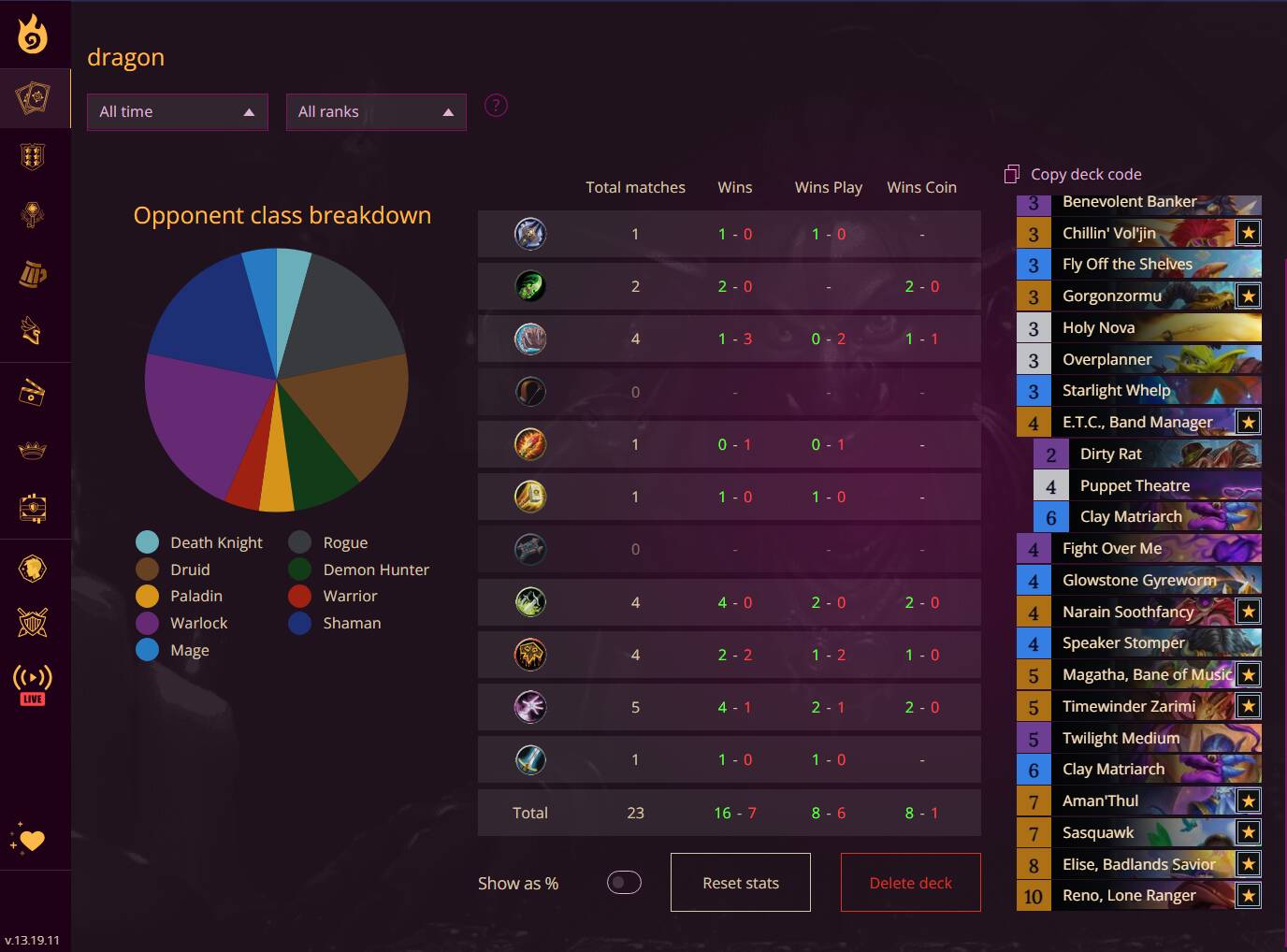 中速:小劣马林德,主要是不能吃枭兽。但在不吃枭兽,牛牛找剧场的情况下还是蛮好应对对方的场面的。和多系萨,多系DK55开吧。前期是对手强势的回合,但越往后拖我们越优势。打DK注意血量,无限冰激凌还是强的。打萨满场上一个怪也别给他留(血的教训)。优开普通的龙牧,大概是因为现在8条龙太严苛了谁也不太好凑齐,我们有一些高质量解场和返场的富裕,对面没有,被抢死就认了。buff骑太笨重了,准时阿曼苏尔几乎没输过;决斗骑倒是节奏好一些,但被削了已经强度有点跟不上了,可是说小优。最后,法术法这个月只打过不过五套,不好确定谁优谁劣,具体情况具体分析吧。