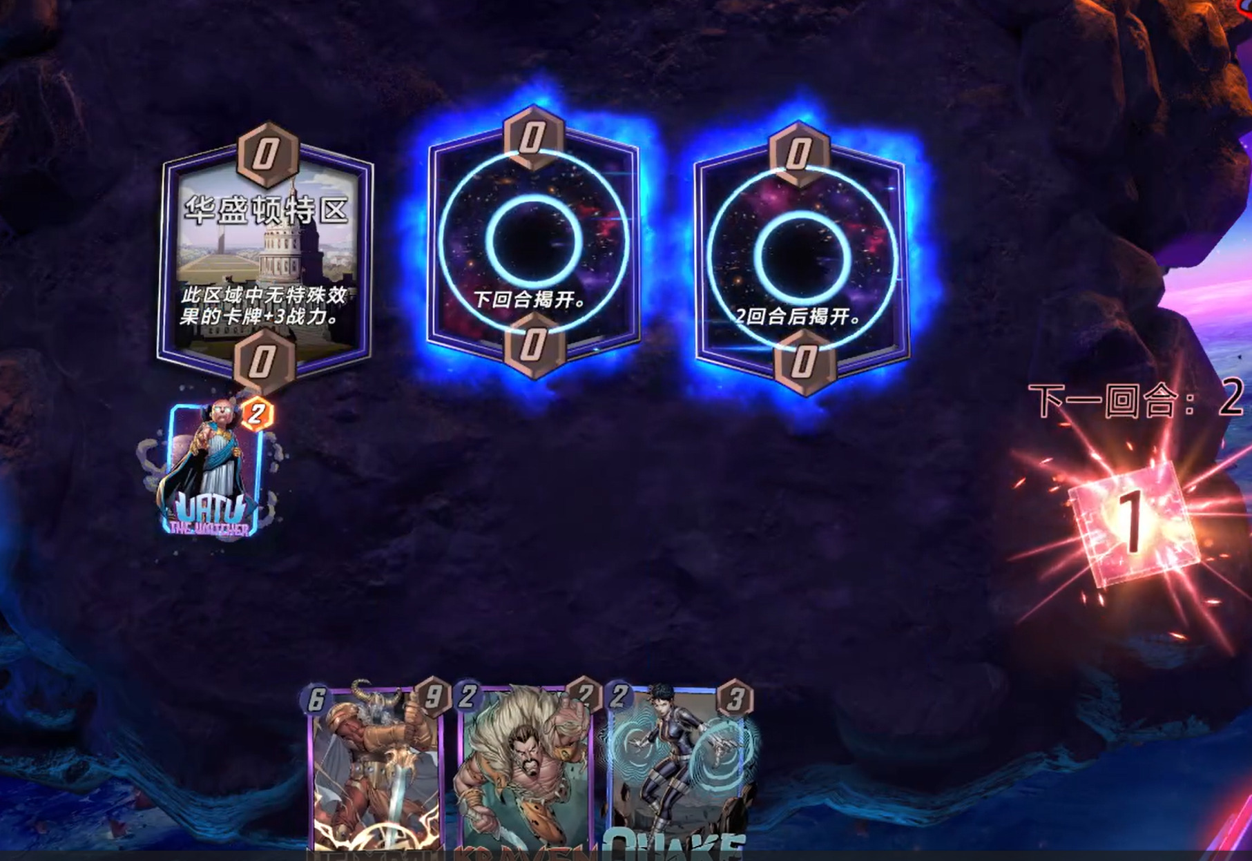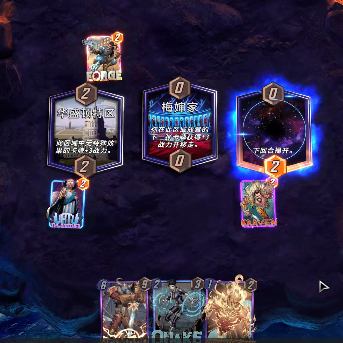 观察者乌阿图 查看两个未揭示区域,分别是梅婶家和冰盒,其中梅婶家对移动有利地形。我们手上有待培养大哥克莱文和海姆达尔,直接snap!并打出乌阿图