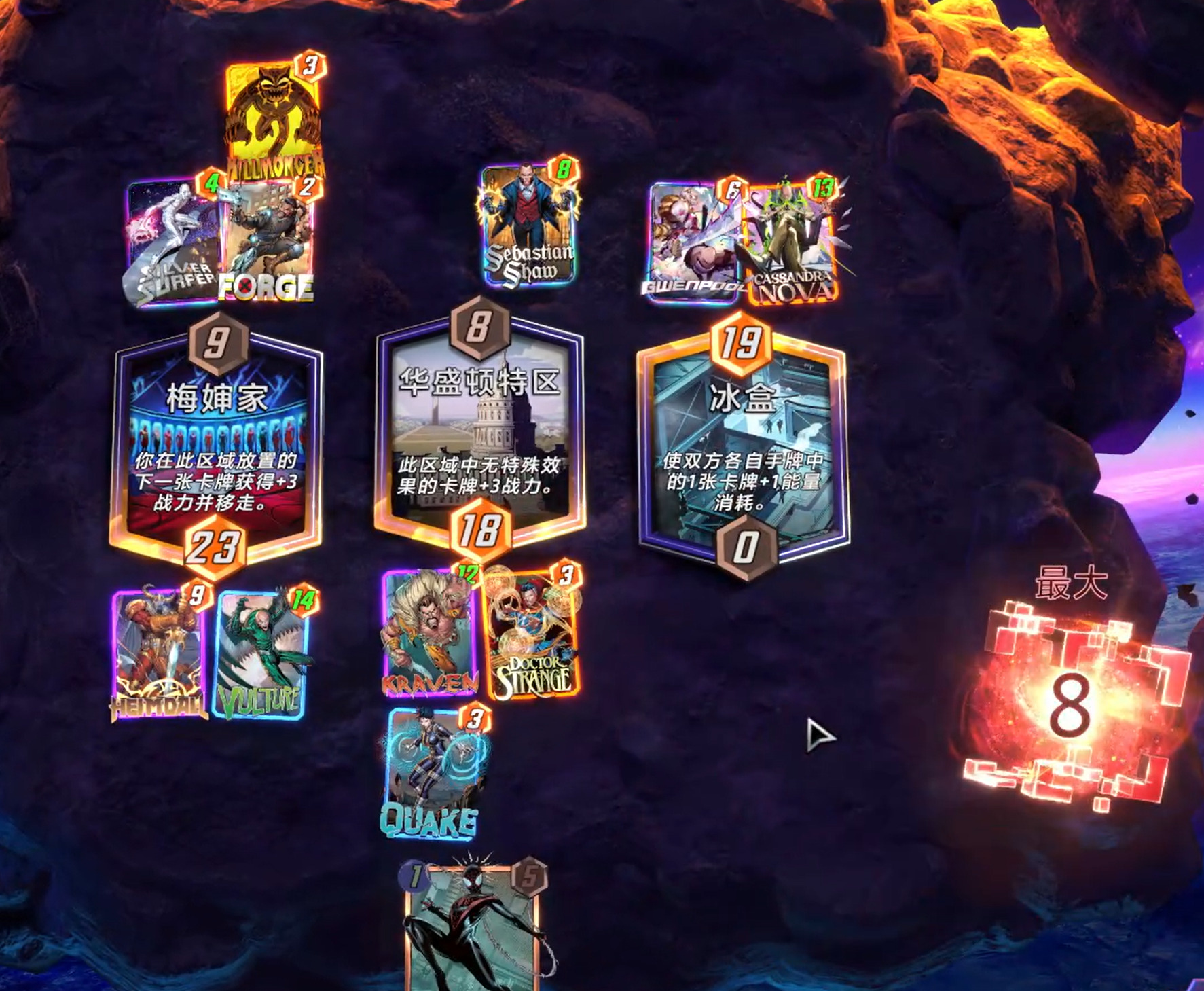 (博弈点:我们右路32点,已经稳稳比对面大,但是对面把卡牌打在了右路,并敢snap一定是有克制我们的卡牌,比如齐尔蒙格或尚气或影王,对面是银滑套牌一般有齐尔蒙格)