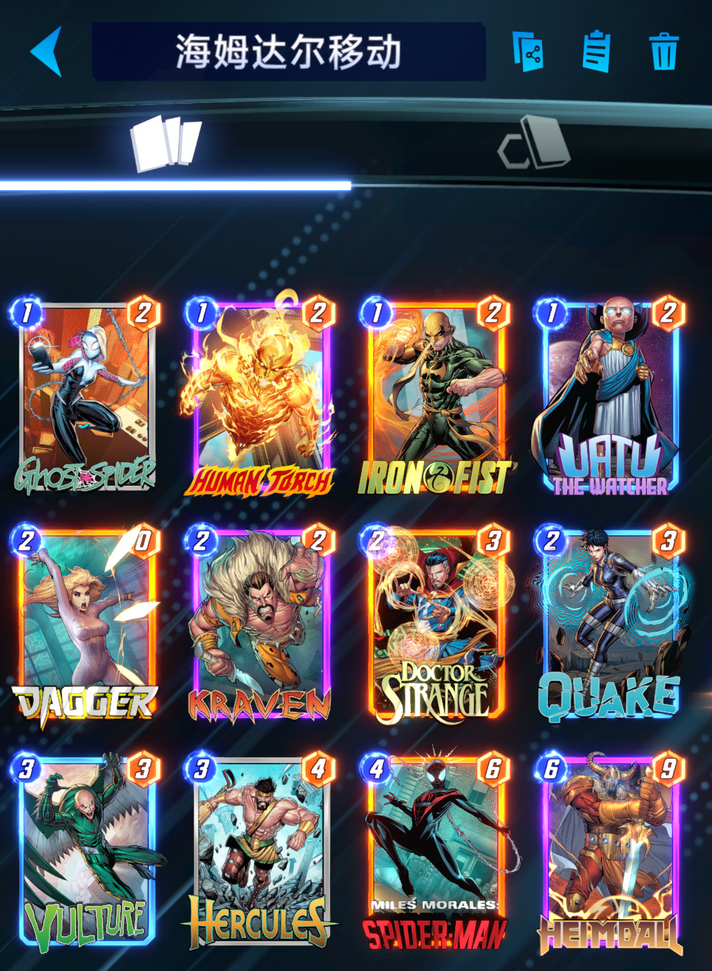 培养计划:幽灵蜘蛛 移动 1次 、奇异博士移动1次、海姆达尔移动1次,再加上赫拉克勒斯这张卡的效果,如果能移动 5次,战力将达到64点