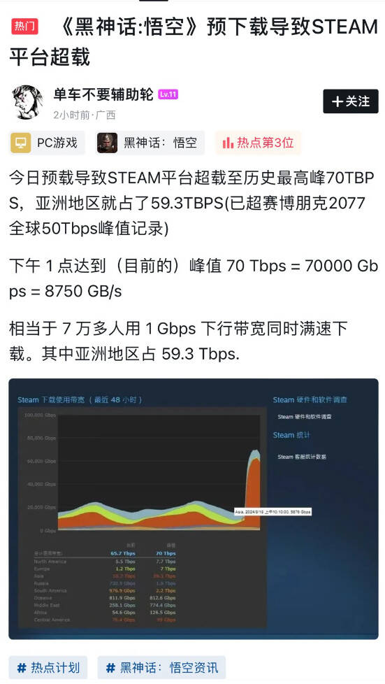 据网友爆料,《黑神话:悟空》开启预载当天导致Steam平台超载至历史最高峰值70TBPS,亚洲地区就占了59.3TBPS,已经超过了《赛博朋克2077》全球50TBPS峰值记录。这相当于7万多人用1Gbps下行带宽满速下载。
