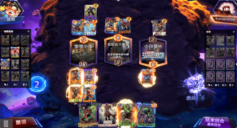 漫威终极逆转(漫威snap),同样也为炉石之父、Second Dinner工作室创始人Ben Brode及其团队制作。作为比炉石更晚推出的游戏,其游戏性、机制的有趣性是毋庸置疑的,其最有特色的就是①战场分为三个区域,需要采取田忌赛马的策略来赢下比赛;