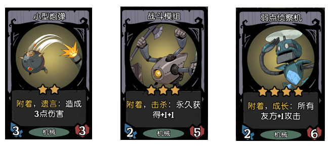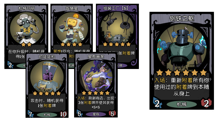 落地附着玩法的基础以机械的三张机械的附着牌为主,之所以说是环环相扣,就是因为需要一个附着牌合金以后再贴给下一个附着牌,然后再合金再贴,到最后随便贴给一个机械然后下狗头钢铁之躯,直接就能让手机卡一阵子。