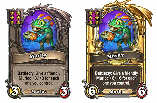 - 旧:[4/4] 战吼:你每控制一个鱼人,使一个友方鱼人获得+4/+4。