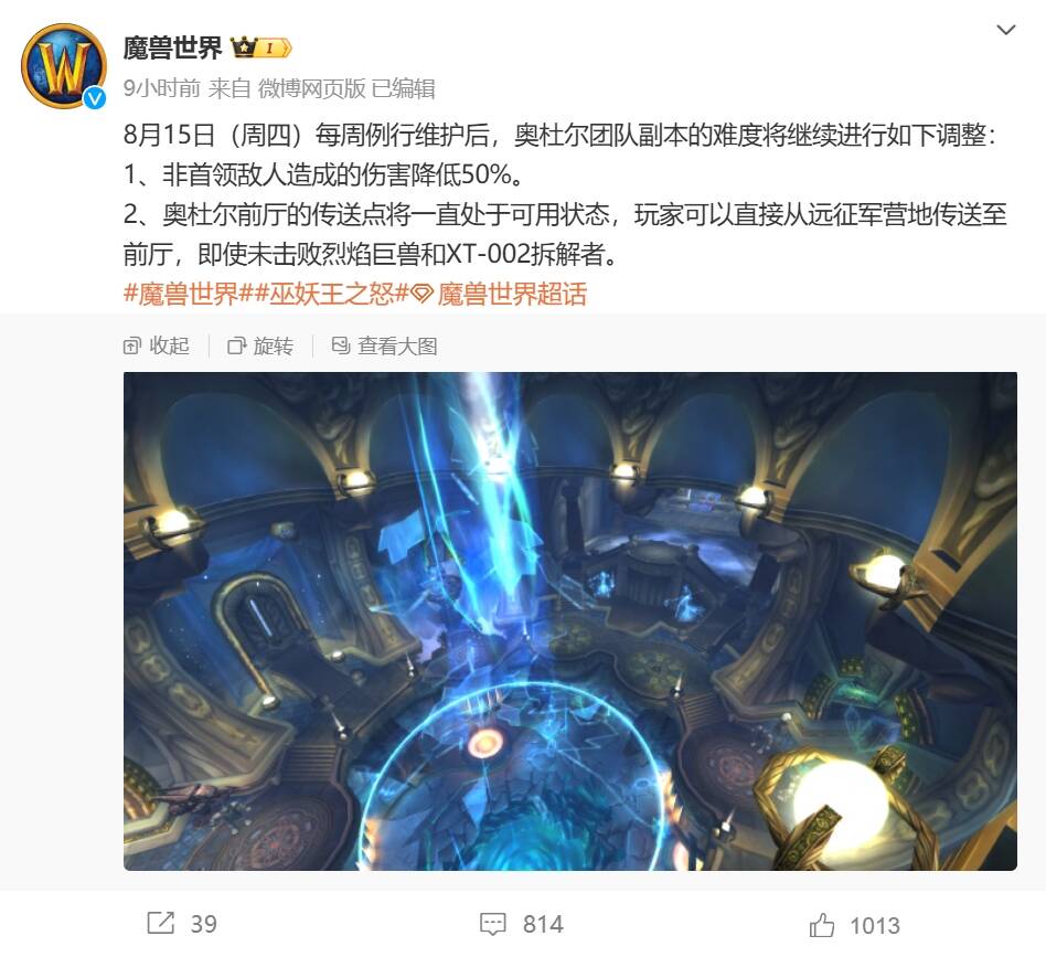 今日,《魔兽世界》官方在微博发布了对奥杜尔团本的难度调整,本次调整下调了小怪伤害,并且新增了一直可用的传送点。本次更改将在8月15日服务器重启后生效。