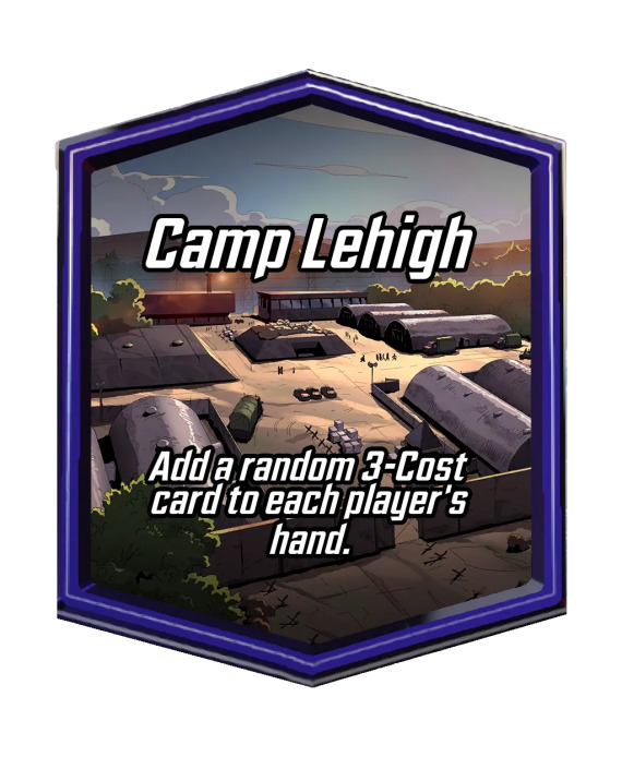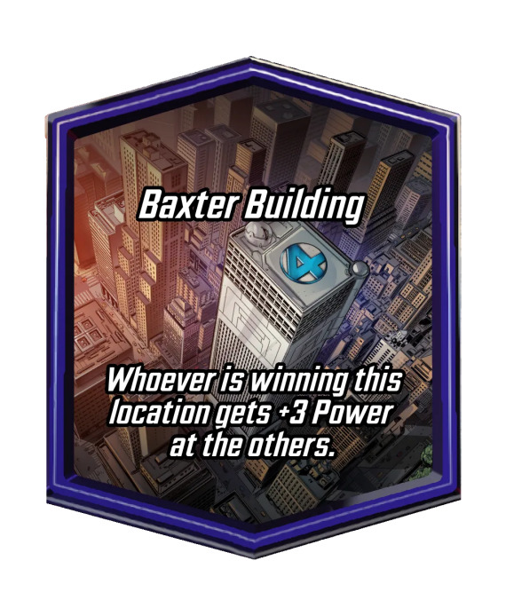 巴克斯特大厦在游戏中的效果是:在此区域领先的玩家可以在其他区域+4战力(图片为老版,后加强为+4)。通过这个地形效果我们就大致能想到这个地形是必抢不可了。在此区域的领先可以让另外两个区域的压力减轻很多,所以尽可能的利用高战力牌去赢下这个区域,如果你确实抢不过,那不如选择毁掉这个地形。