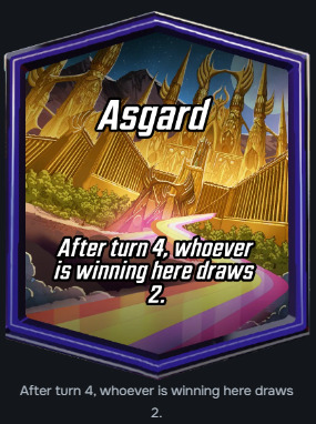 而在终极逆转当中,阿斯加德地形效果是:在第四回合后,在此区域领先的玩家抽两张牌。在此区域领先的话会获得更大的一个手牌优势,因此大多数人都会去选择在前期抢这个区域的节奏。但是玩家们要注意不要为了这个区域的领先,放置了过多的低费低战力卡牌而在游戏结束时输掉这个区域,那就有点得不偿失了。