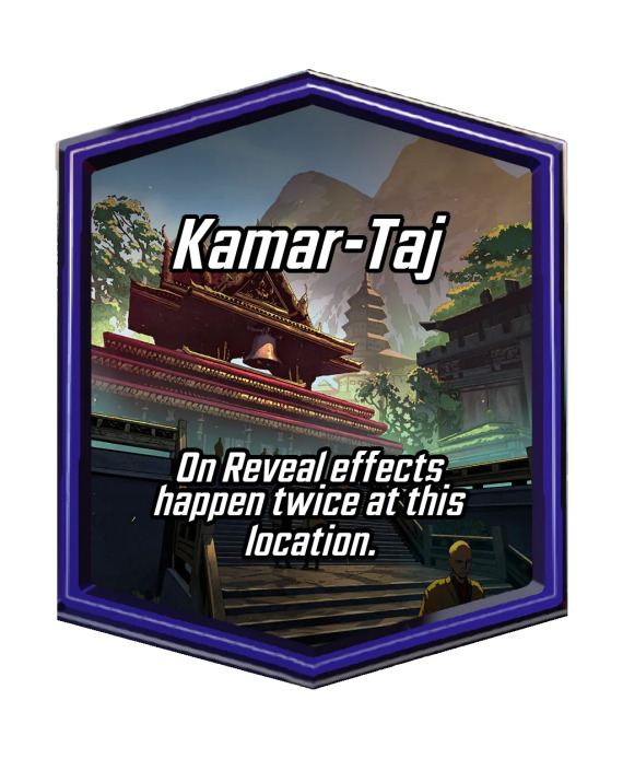 在漫威终极逆转当中,卡玛泰姬的效果非常的简单粗暴,在此区域放置的卡牌揭示效果触发两次。和王的效果是一模一样的,这里新手玩家要注意,这个效果只针对放置的效果,对于移动过来的卡牌是不产生效果的。这个地形对于新手非常友好,因为很多低卡池的牌例如钢铁心、白虎、奥丁都是一个很大的加成。如果你拥有的王,就在这个地形放肆去耍吧。