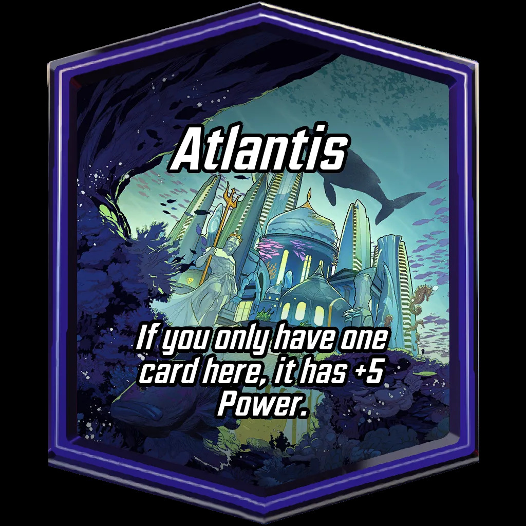 在终极逆转中亚特兰蒂斯的地形效果是:如果你在此区域只有一张卡牌,该卡牌战力+5。这个地形和卡牌纳摩的效果也是一样的,所以也就是说如果只有纳摩这一张卡牌存在亚特兰蒂斯地形,就可以+10战力。在此地形,如果你想要吃到地形加成,那么选择一些强力单卡绝对是明智的:次元行者、红浩克、纳摩、肉球等等。当然我们也要根据局势选择是否要铺场来提高自己在此区域的胜率。