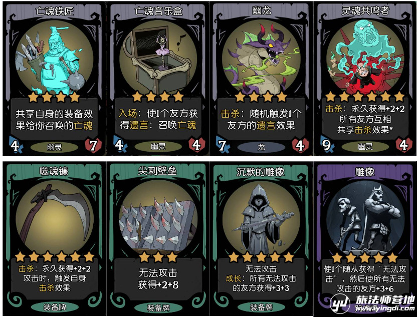 5.阵容2的搭配更像是“无限击杀流”中把“套娃”的位置替换成了“亡魂铁匠”。都是依靠“噬魂镰”触发友方遗言,继而达成“无限召唤”。