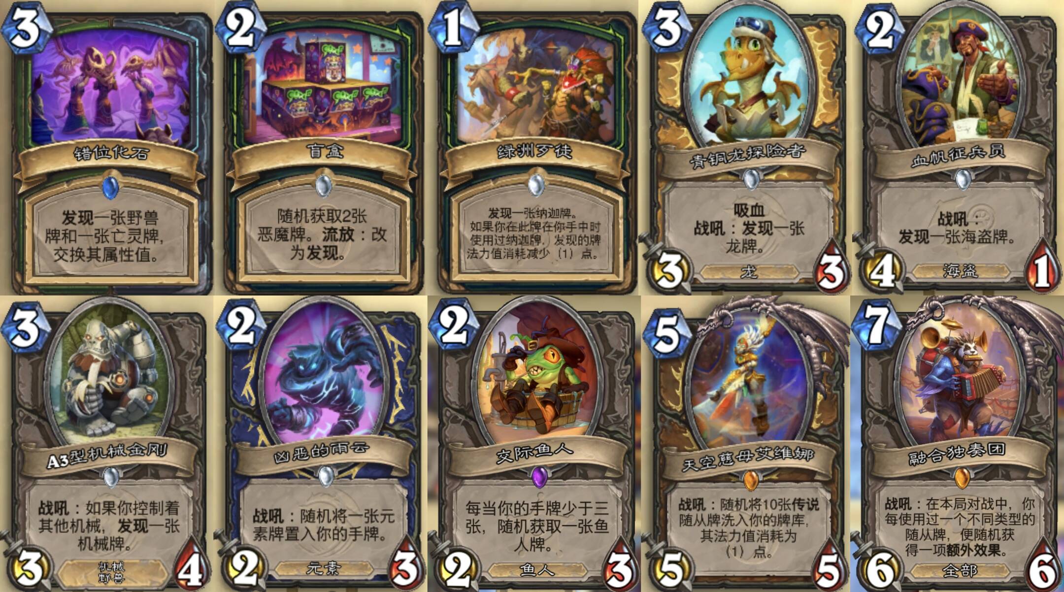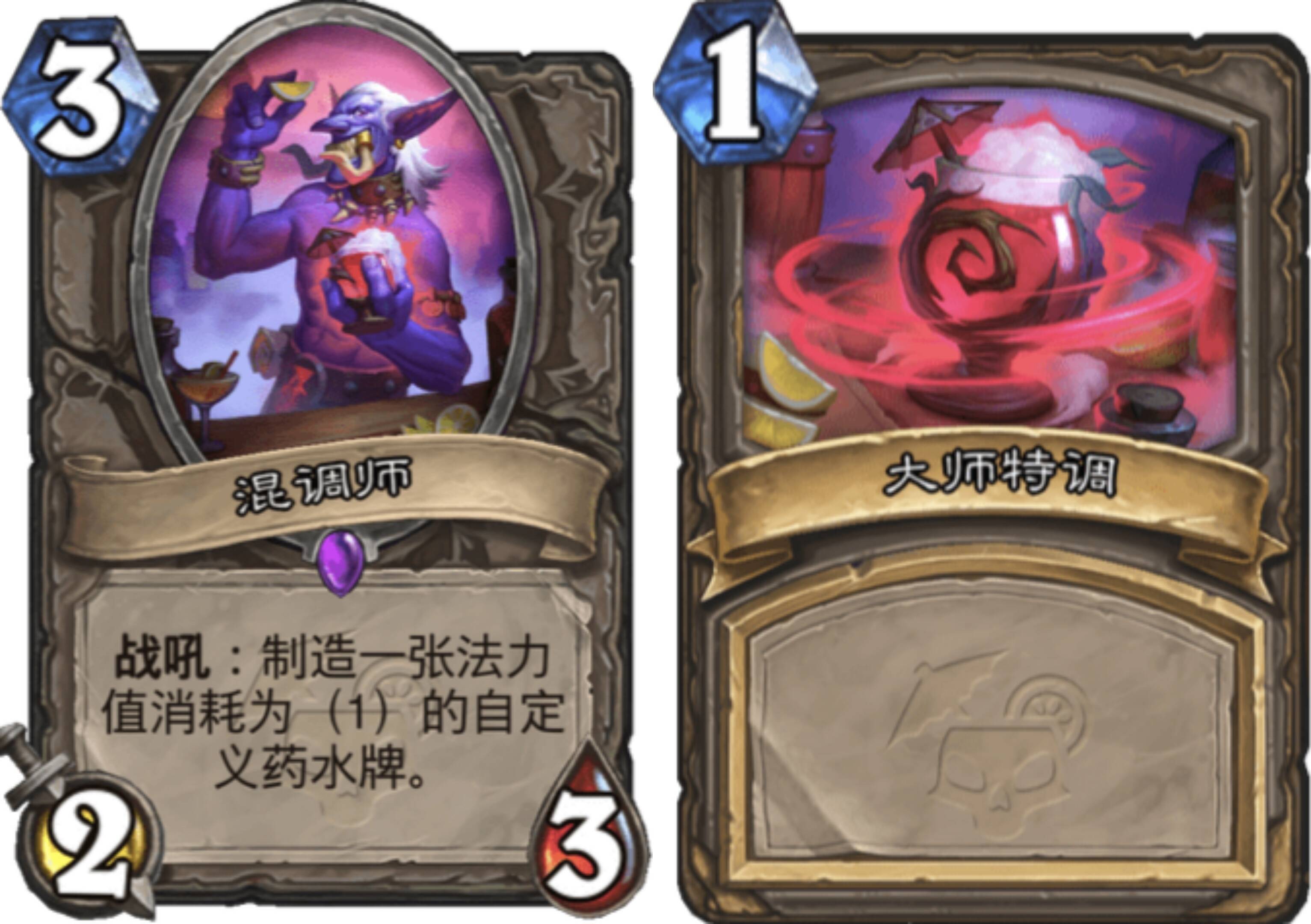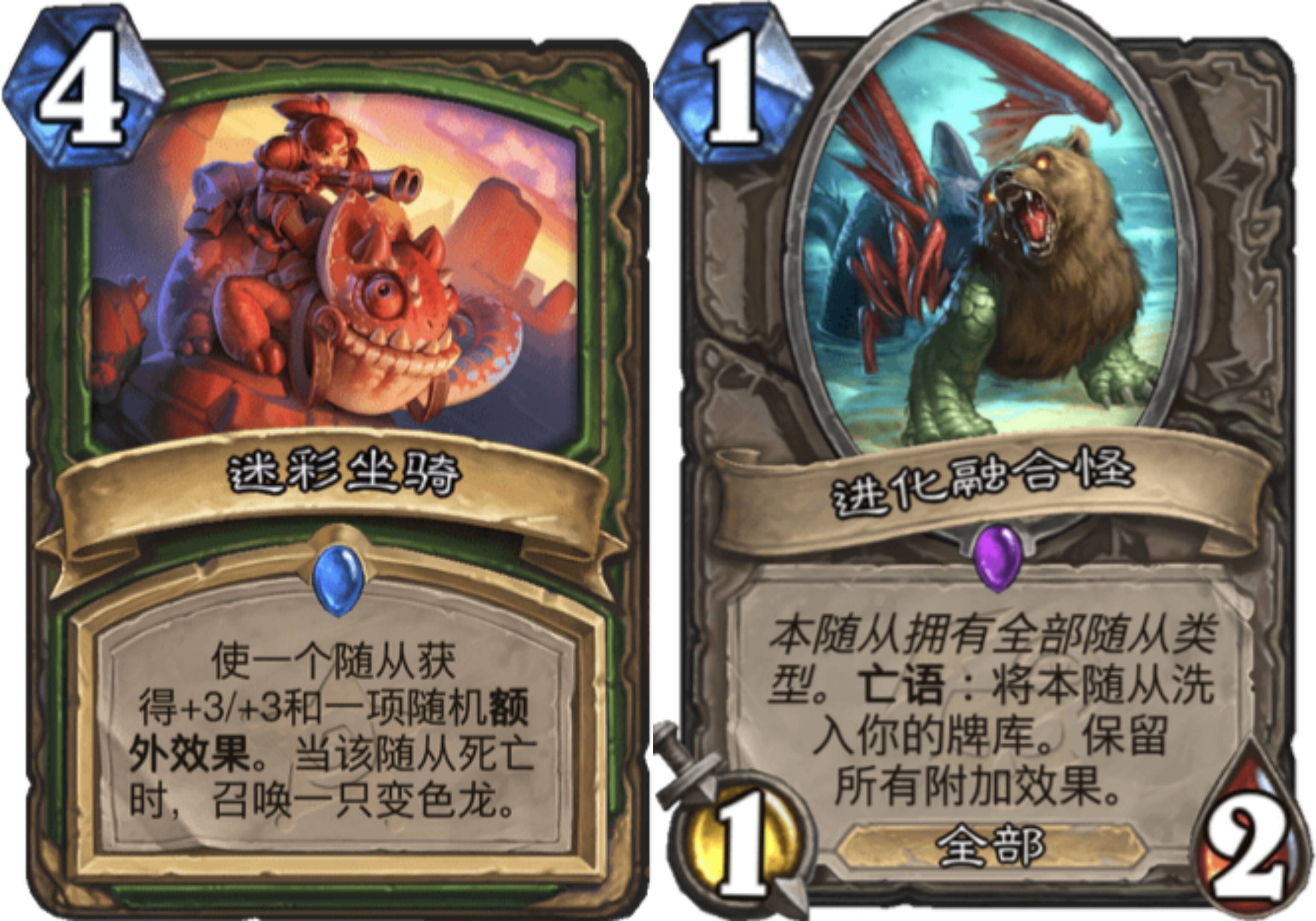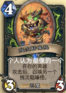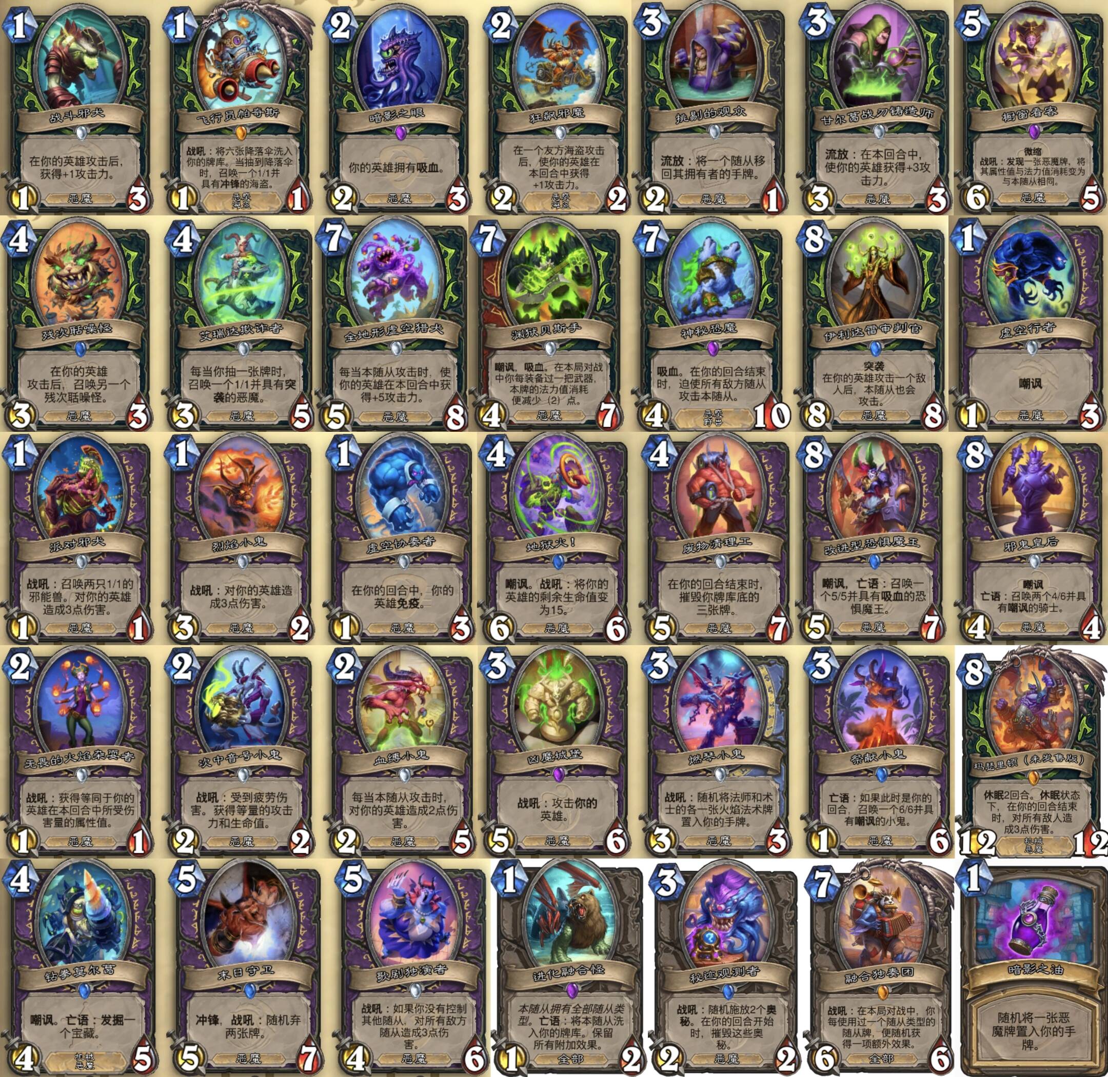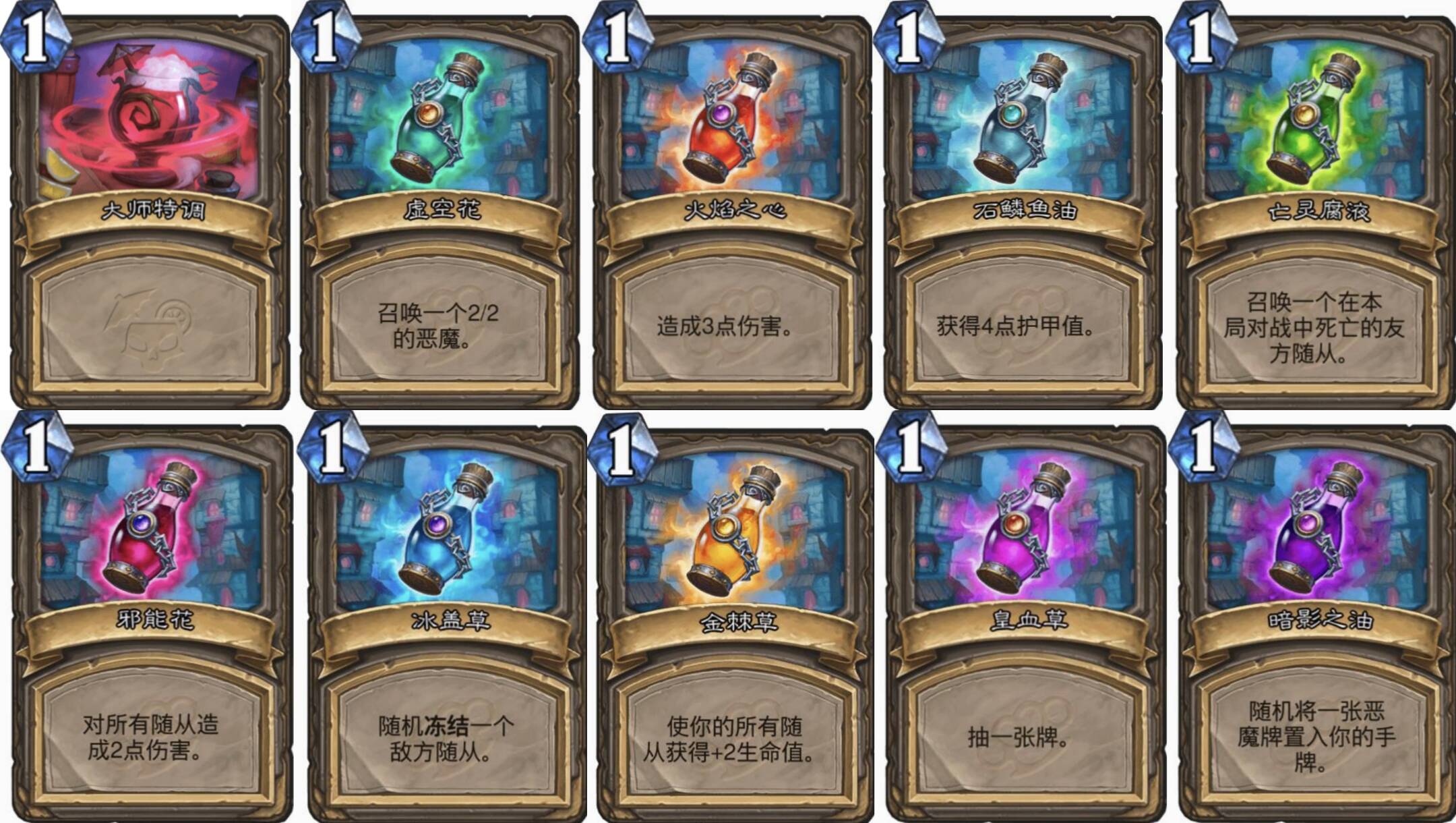 还有一种自定义是混调师的药水,它的机制是先从九种药中发现,再从剩下的八种药中发现,最后混合在一起,但由于药水间没有什么配合,我们只需要计算发现某一种药水(例如打3)的概率是58.3%。还有a2复活抽牌这些也比较常用,这个随机恶魔应该没人拿吧?我知道驴哥拿过,但他是奇蹄目不是灵长目。