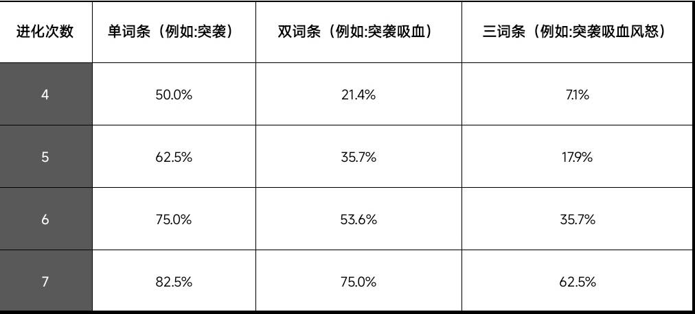 如果形势比较宽松的情况下,进化次数少一点也未尝不可,这个看每个人接受度的不同。如果情势异常严峻,非得突袭吸血风怒一起出不可,那进化6次只有35.7%的概率救得了你,请三思而行,游刃有余。