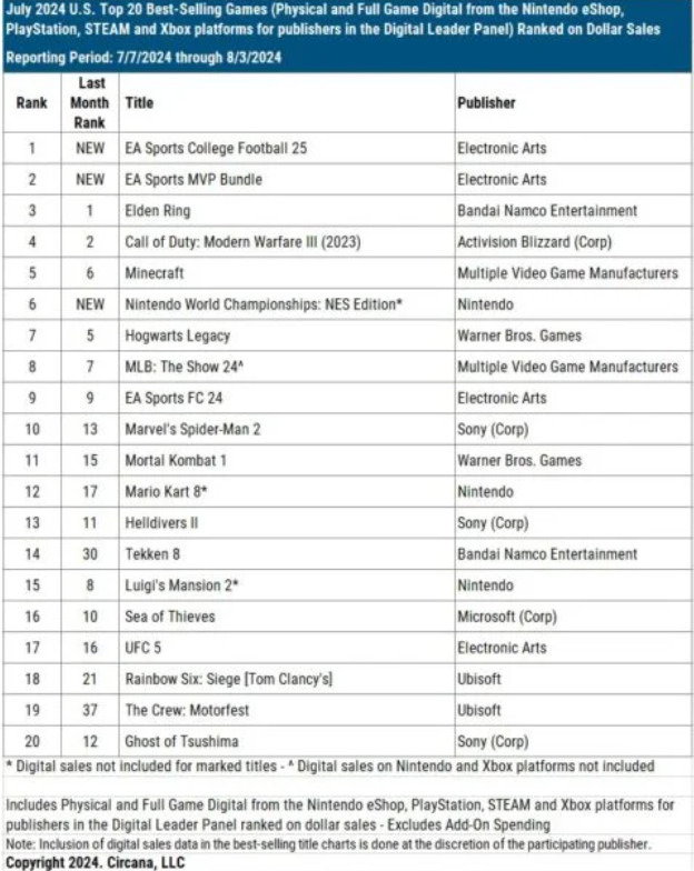 EA Sports《大学橄榄球25》超过《绝地潜兵2》成为2024年至今美国最畅销游戏。