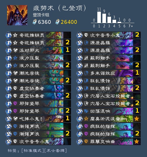 我也是一个老玩家 会不会以前玩的时候是那个开服,奇迹贼,动物园那些,最近回归弄了一个欧服的账号打了一点竞技场 然后看到有主播用这套卡组登顶,这套卡组也比较便宜 7000多尘就弄了套,玩了几天 也上传说了,对战各职业。暂时还没有遇到那种特别无力的局面除非特别卡手,这种情况也是极少见的,因为这套牌过牌很多,最后说一句 这种被主播推荐的登顶能登顶的套牌都是非常厉害的。兄弟们可以打牌的时候多思考思考每一套牌的精髓
