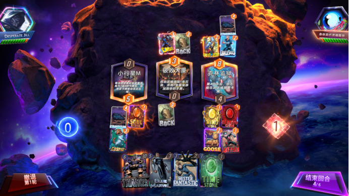 ②需注意灵蝶及灭霸的时间宝石(都可在下回合提供一点额外能量)一般情况下只在第三回合打出,这也是绝大多数灭霸卡组的最大核心点:通过3回合跳费在第四回合打下x教授锁定一路赢下对局,即使x教授没有上手也是如此,只在第三回合打出跳费4回合拍5费牌蓝惊奇或是恐龙也是个极佳的节奏,更何况还有X教授神抽的可能。