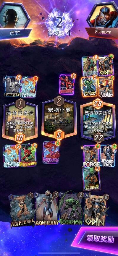 最后一回合,12两路领先,可以推算出我在3路打出大头几乎可以锁定胜利,必胜局,这里对手选择撤退我们顺利赢下比赛,这局可以看到,即使王没来我们这套卡组仍有一战之力,如果王白虎奥丁全来我们更可以放心按下snap了。