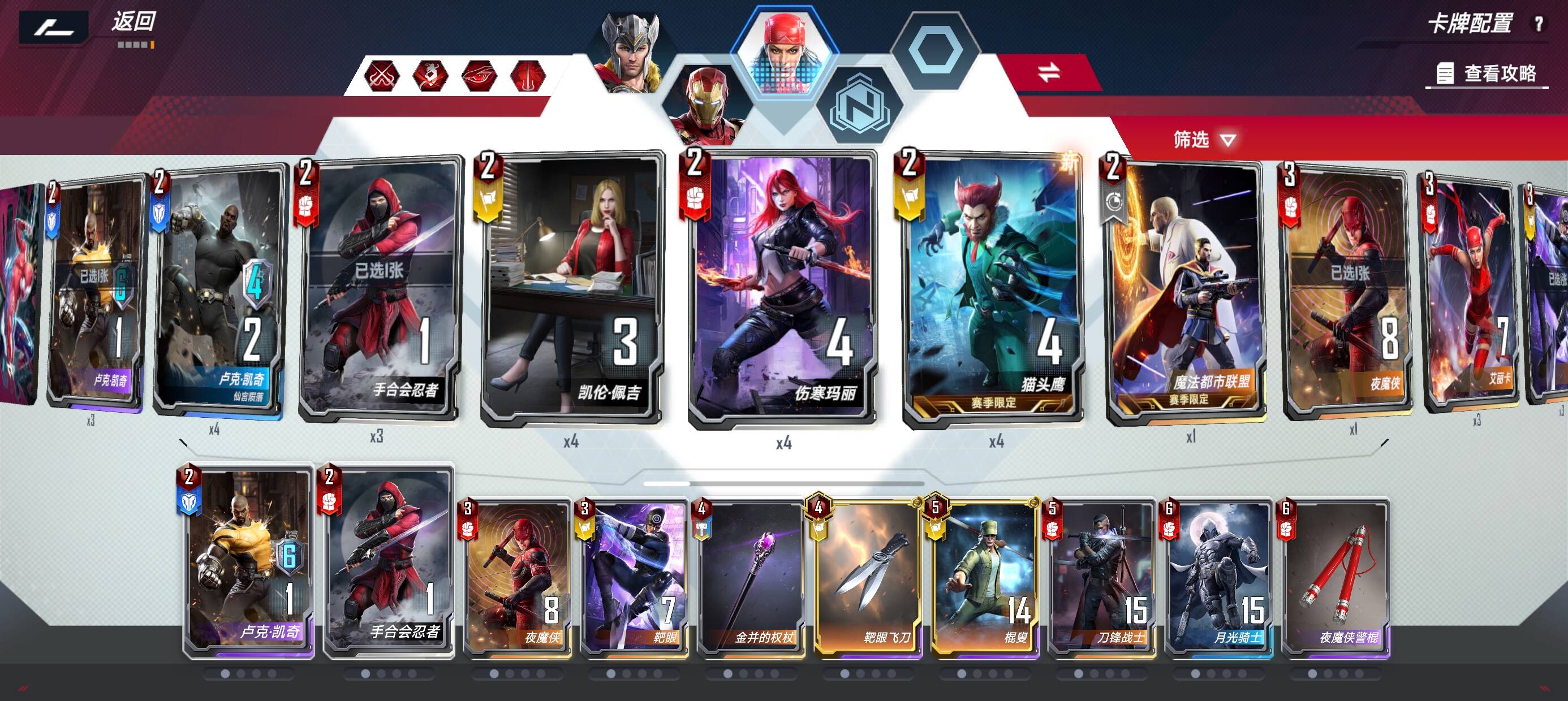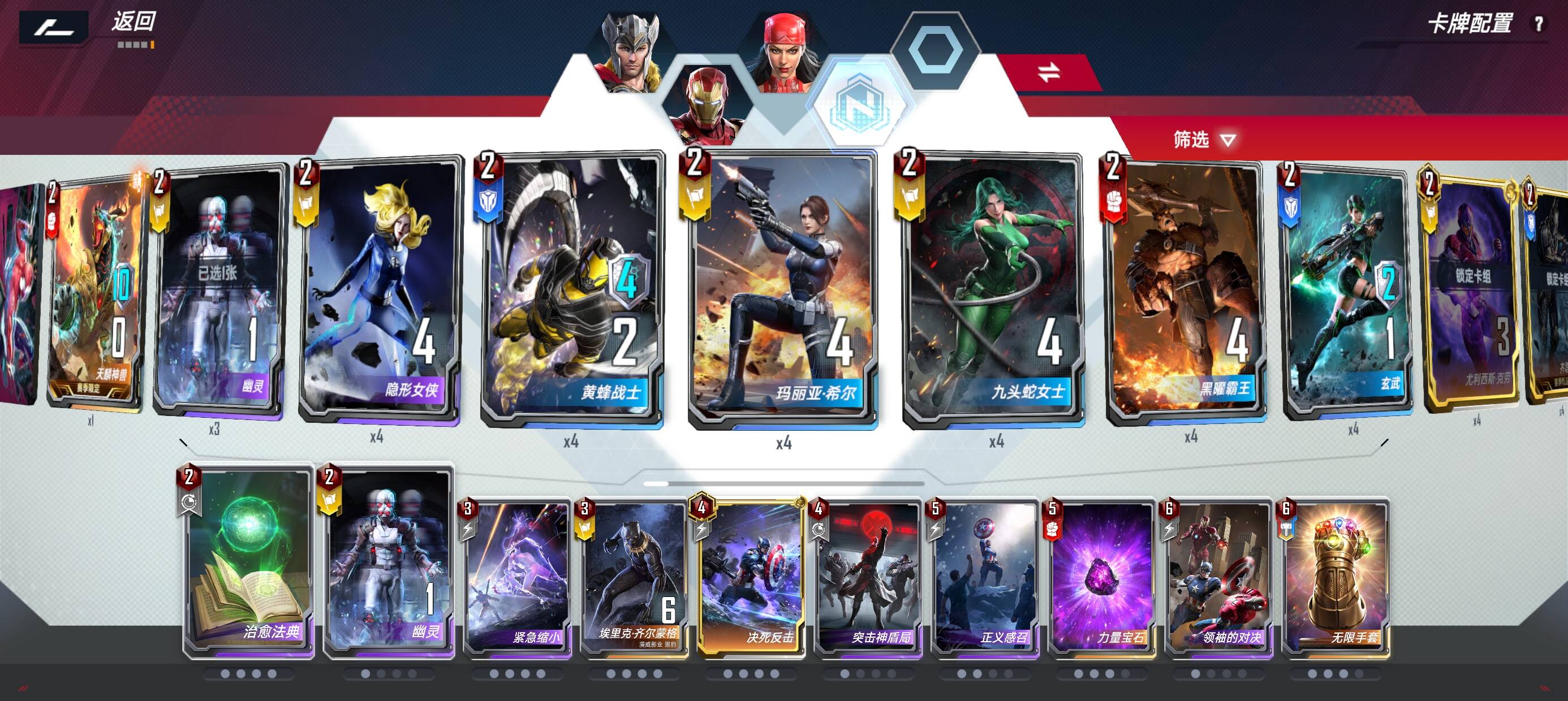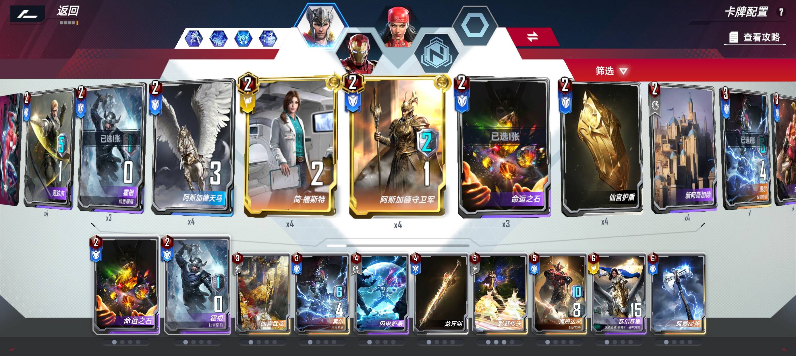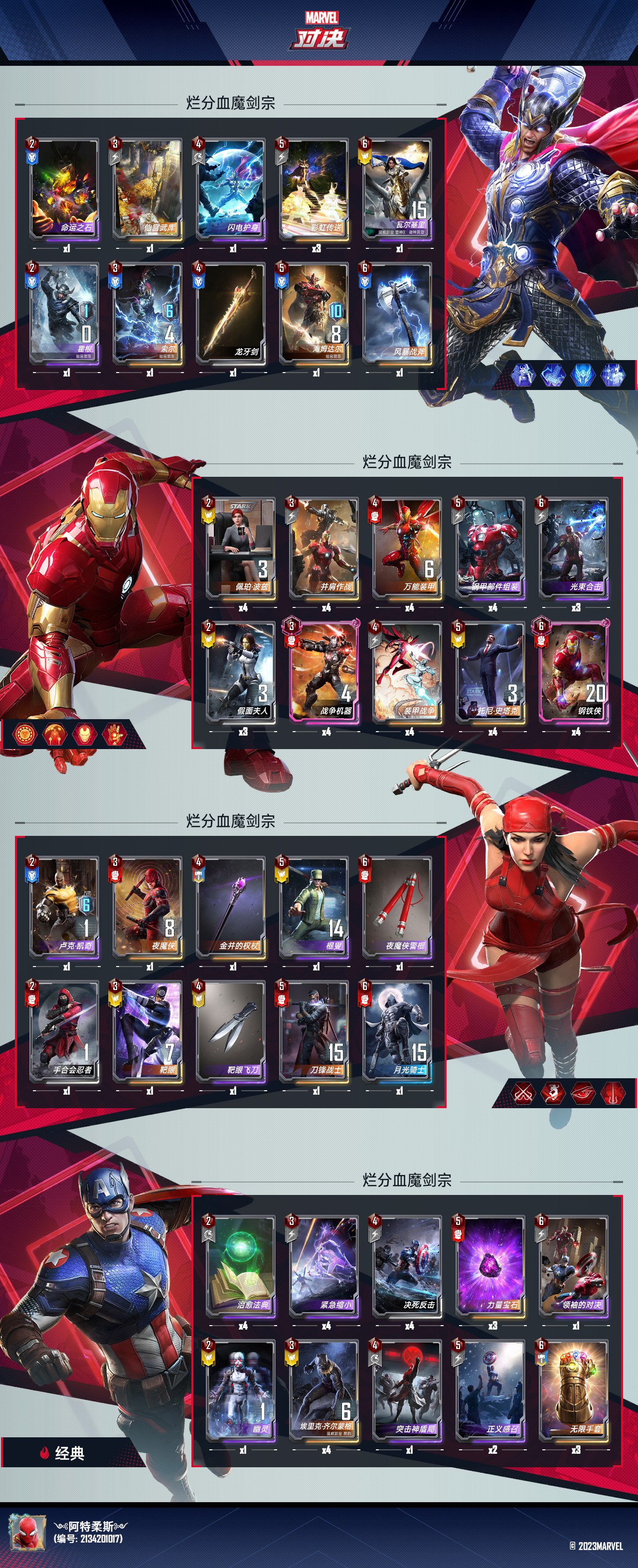 出场搭子方面星爵海拉都被我换了。血魔的滤牌怎么能不带仙宫套呢,索尔还有彩虹传送,艾利卡也是血魔的好搭子。高性价比的战吼以及绝经归来都是好东西。