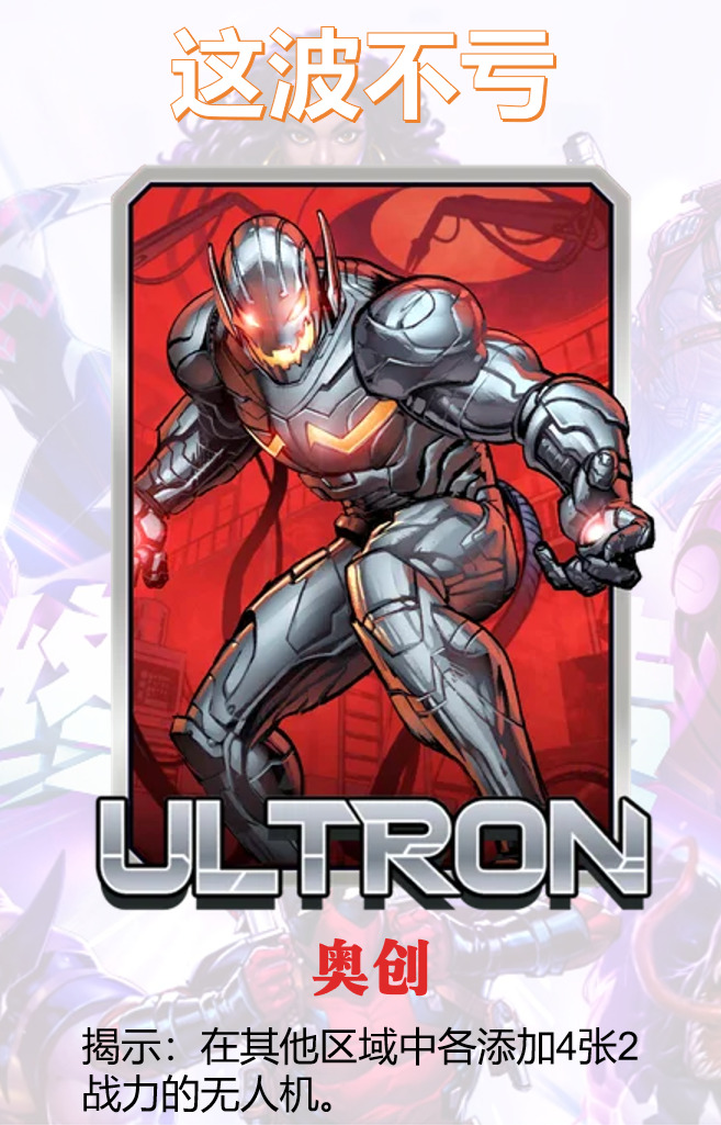 - 同样前三回合什么都不干,第4回合卡扎尔,第5回合蓝惊奇,第6回合奥创,你就能得到8个4战力的机器人,加上卡扎尔蓝惊奇和奥创自身,也能打出49点战力。