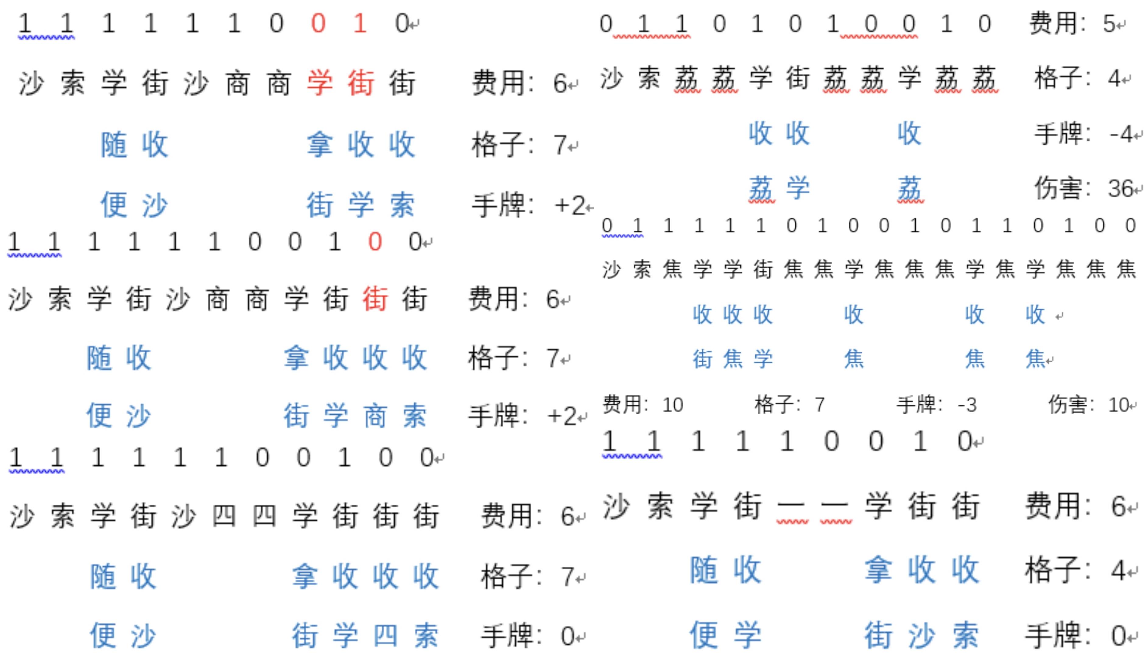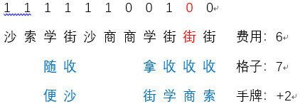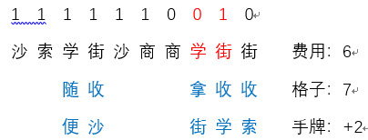 最基础的公式大家应该知道,如视频所示:就是沙索学街沙商商学街街,最上方的0或者1是费用,打完这一套需要六费7个格子(如果把红色的部分留到下回合再打这回合就只要五费),并增加两张手牌,因为一费的学徒街舞商家持枪都会使你的手牌不降反升,我注意到手牌快满了,所以伺机待发硬币,为了证明这个硬币没用,我最后留了一费。
