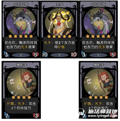 4.战斗开始,二位一体的“灾厄神射手”就会率先发起攻击,那么1号“灾厄神射手”攻击后,就会因为“灾厄巨龙”的效果“攻击后,触发同排其他友方的先手效果”,继而触发同排的“圣龙”补充护盾,触发2号缝合随从“灾厄神射手”的先手效果。同理,只要2号攻击后又能继续触发同排的“圣龙”和1号的效果,达到“无限护盾”和“无限攻击”的操作效果。