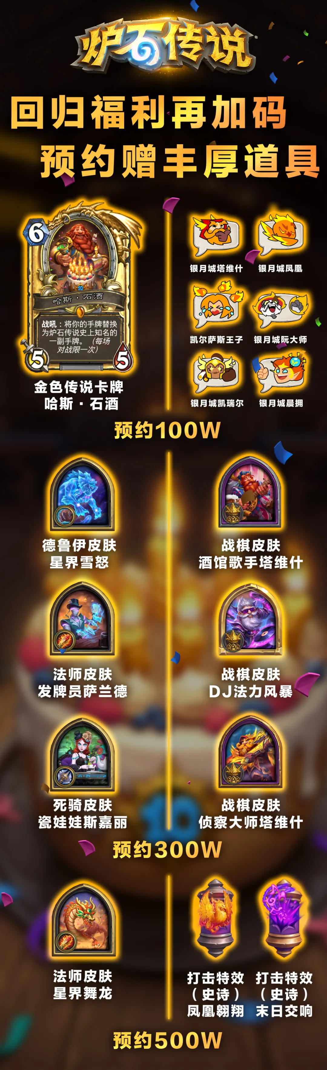 炉石国服的回归今天又有新动作,开启了回归预约活动。当然,预约是有好处的,预约人数越达标,所有国服玩家都能在开服后免费领取更多停服期间的外观奖励。