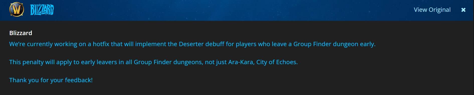 我们目前正在开发一个热修复,为提前离开随机地下城的玩家施加逃兵debuff。
