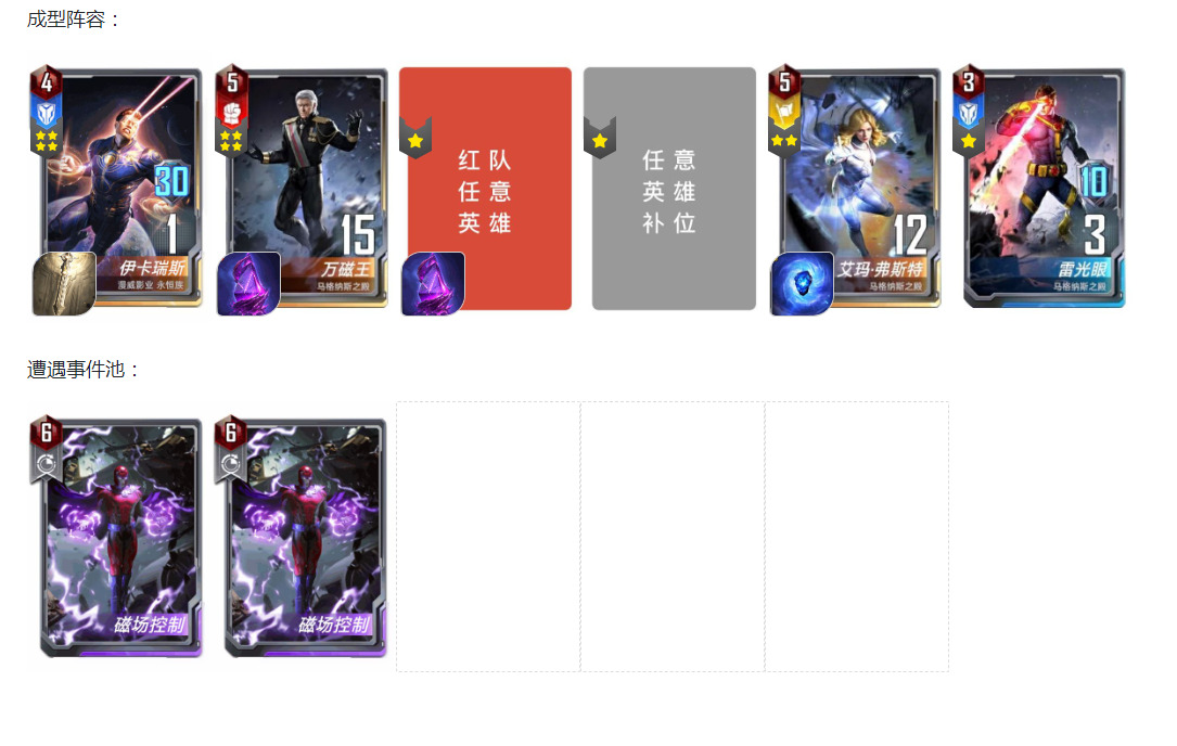 3、本卡组后期利用获得万磁王技能:变换身形(后期可将养大的伊卡升费用,比如变为异界古一、美队、索尔等)、金属控制(可将伊卡的战力护甲都传给3费蓝雷光眼、6费瑟希),6费智合体事件(回收场上永恒族词条角色同时刷新商店,随机一张商店卡战力变为回收的战力之和),爱国者给的牌极限时还能组合出高攻击黄钢铁侠奥创链接等这几种手段使场上人物、效果、打法发生改变,避免被夜巡,具有一定的娱乐性和多变阵型。
