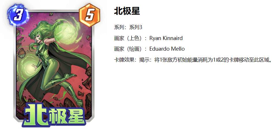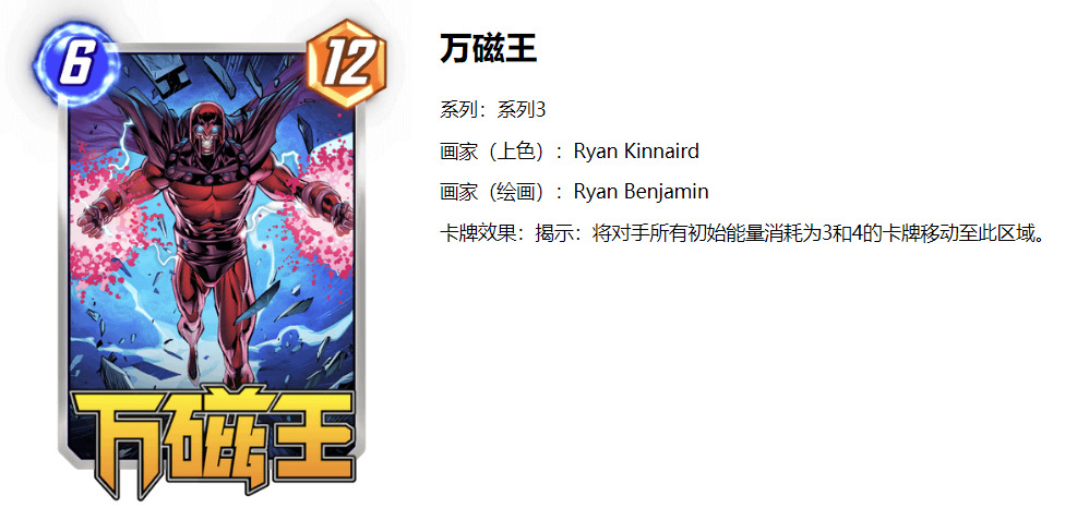 除了以上这些,还有一些控制打断类的卡牌有移动特效,比如红坦克,万磁王,北极星,这些卡可以强制对面的卡进行移动,要么把对方这个区域这回合下卡牌移走,要么把对方需要3~4费的卡移动过来,又或者把对面1张1~2费的卡拉到这个区域。不要小看这些牌,很多时候对面成型的卡组,你只需要一张先揭示的强制移动牌就能反制,比如万磁王把对面战力成型的毒液拉走,让对面6回合下的电视机没有可以摧毁的目标等等。