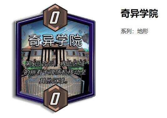 奇异学院,第5回合后随机移动到其他区域,如果在这个区域下卡,它会被随机移动到其他区域,打断其他区域的卡牌配合,所以常见的处理方式是这个区域不下卡,如果前期你的卡关联性没那么强,都是高质量单卡,那么这个地形对你影响不大。