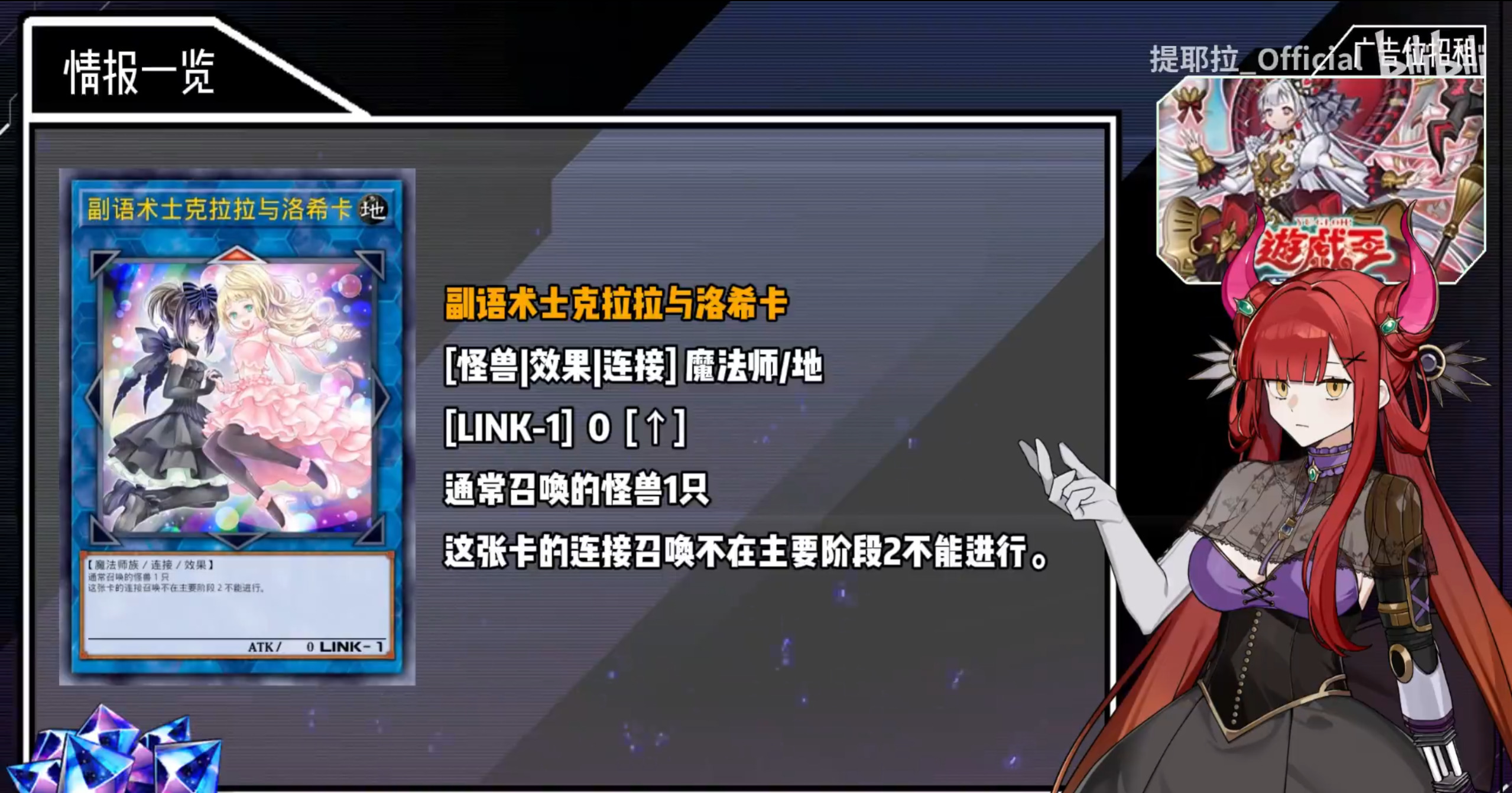 顺便再介绍一下刚才天杯龙额外里出现的新姑娘,副语术士克拉拉与洛希卡,召唤条件是通常召唤的怪兽一只但是只能在主要阶段二进行,这是用来处理贴纸千差万别的妥协手段,正常情况下天杯龙卡组里的link1主动撞针龙在千查万别存在时无法特召,但是换成副语术士后就可以做出小夜除去后场的千查万别。