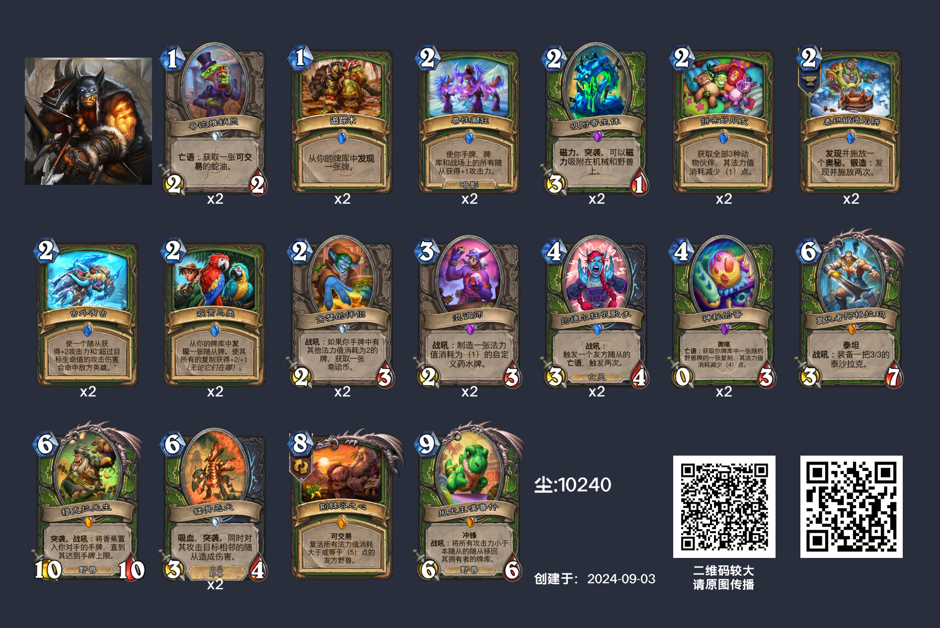 设计师的加强和环境的整体降速使得猎人苦尽甘小来(虽然我觉得LoveLeeBo当年开发的宇宙猎也有不错的强度)。尽管目前的蛋猎是一套比较依赖神秘的蛋进行中期超展开的(没有神秘的蛋也能玩,但是进攻能力差很多)、在我看来有一点“大哥萨下位替代”意思的卡组,但是在这个偏慢且较为主流的卡组中期解场能力一般的环境里也算是有一席之地了。