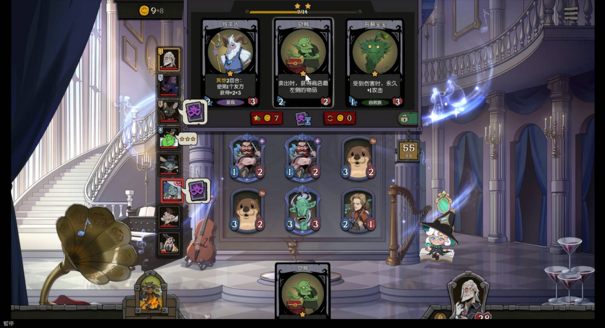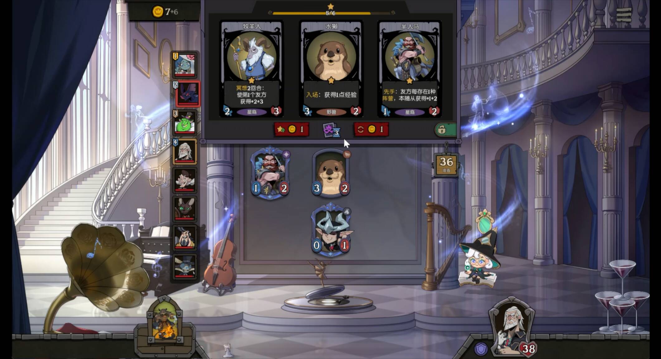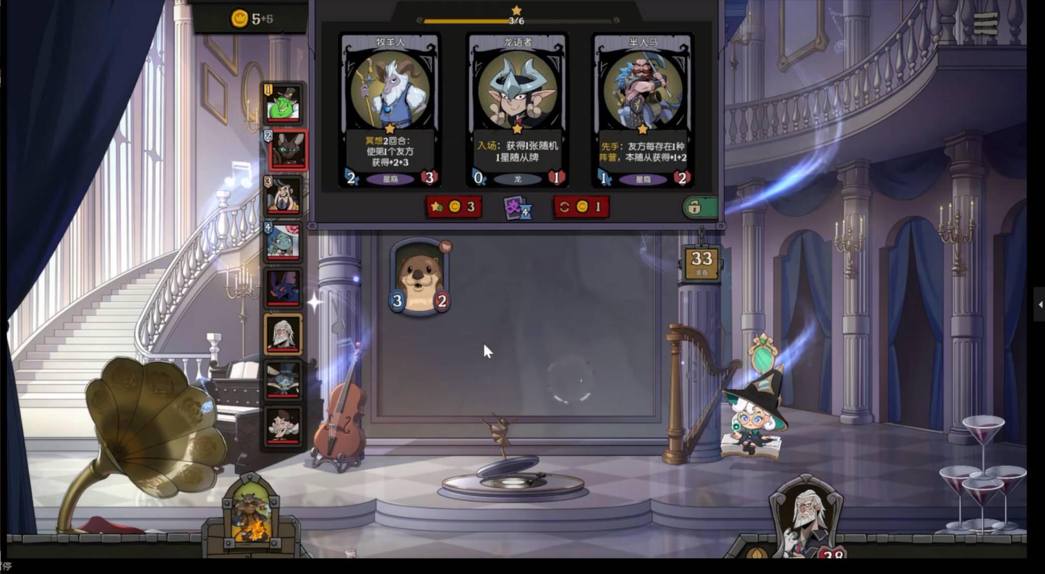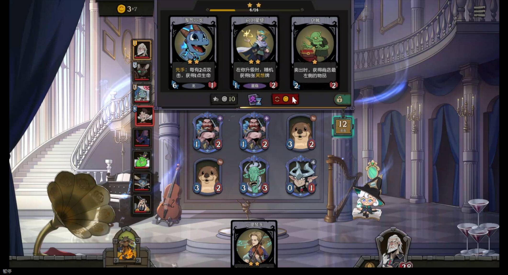 有中立拿中立,这里在拿下马桶刷新之后,看到小提琴手赶紧拿下,由于我们还有4金币我们选择d一下牌,只要出中立都是赚的,并且我们还有两个1本对子,也是有机会三连,如果对4出了林地看守,那我们上本的速度是飞快的,拿下窃贼等待下回合。如我们所料,两只半人马,保证了我们在舞伴出来之前,没有掉血,这很关键。
