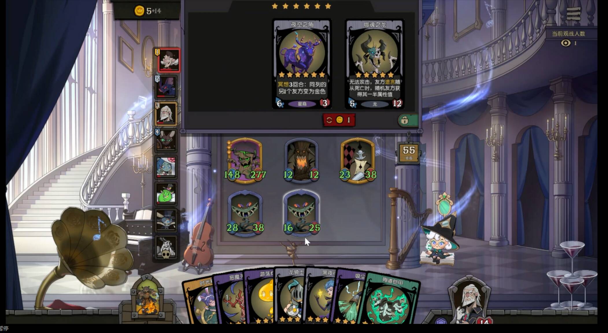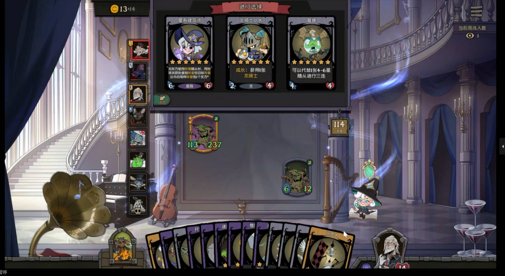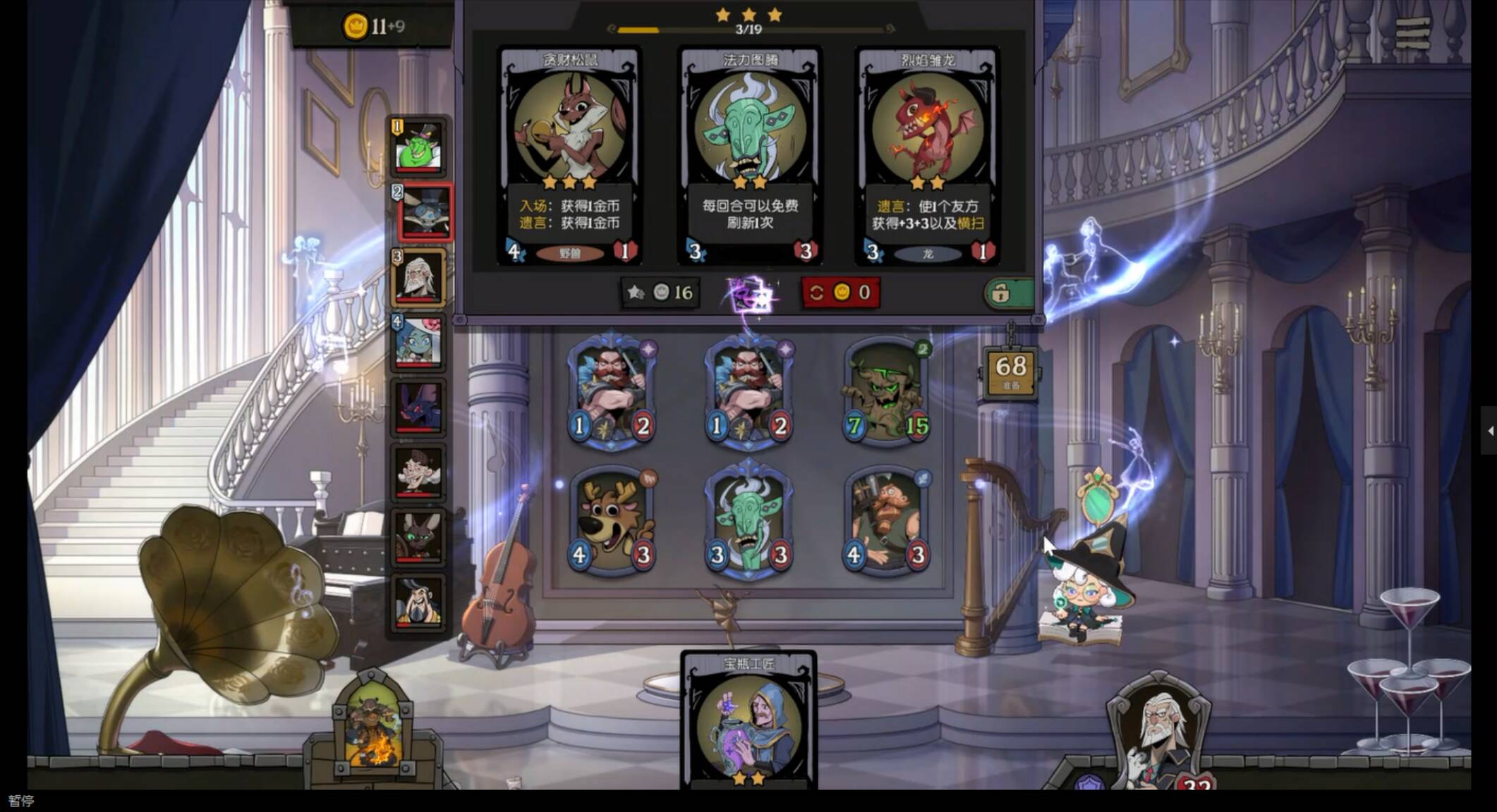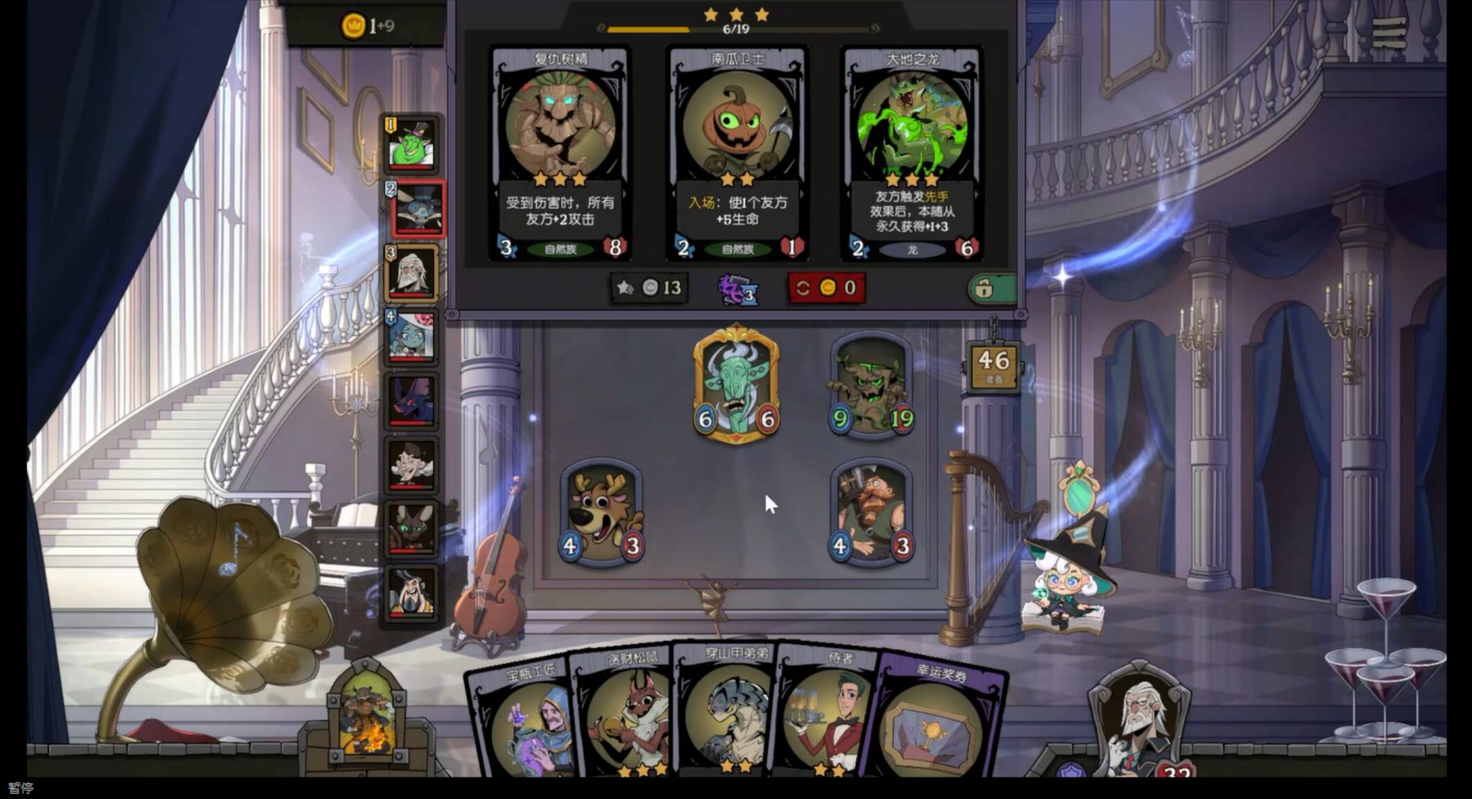 舞伴三连,还是开五找狗头,还是没能找到,又拿了抄写。因为离升本还早,我们这里将所有金币都花完提升战力并且配合入场双小鹿,我们可以免费升本。对面是贪婪地精,不能给他一点机会,给他机会就是对自己的残忍,一定要吧战力拉到,满中满切记在你有树精和小鹿的情况下,每回合要把钱花光!不会亏的。所有操作打完之后,抄写树精腾格子,下回合对6本核心怪。