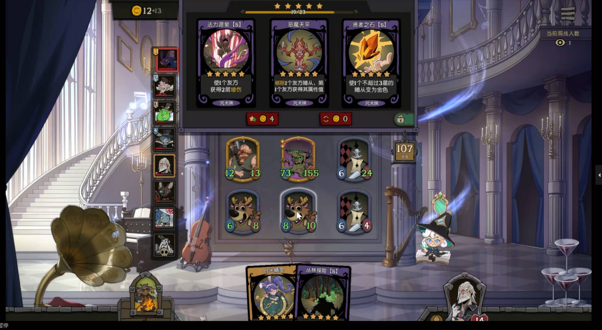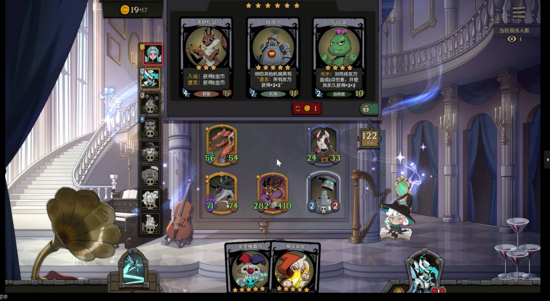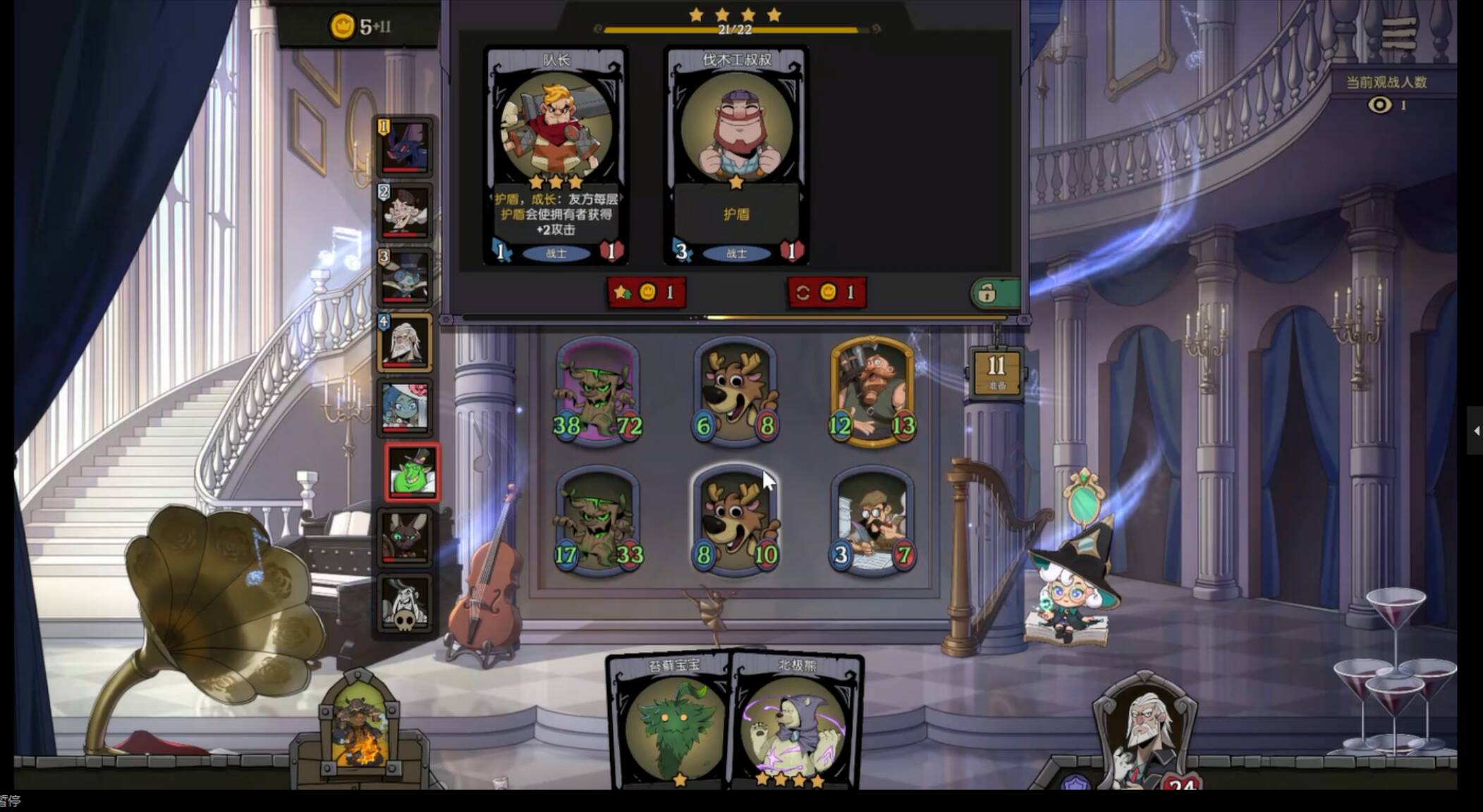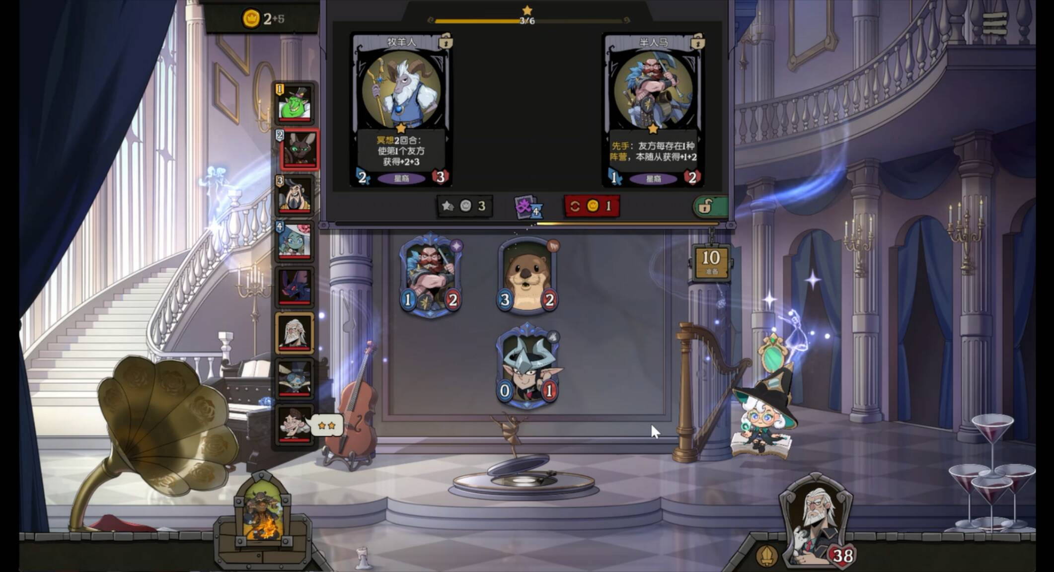 拿下窃贼后直接升本,因为还想将两个1本对子三连,所以直接选择了将小提琴手卖掉,看有无量产工厂,但是无巧不成书,直接来了邀舞,我们直接提前舞伴进行免费刷新,刷到了狂乱树精,那前期的血量无忧,直接可以一直刷新,无脑买卖了(再次强调,有一些咒术可以不着急选,等刷新到有需要的时候,或者节奏需要升本经验,再进行选择,这里就可以选择点金一本窃贼拿下树精从而省钱)继续刷新,小鹿也来啦,我们的配件就差一个林地看守了。
