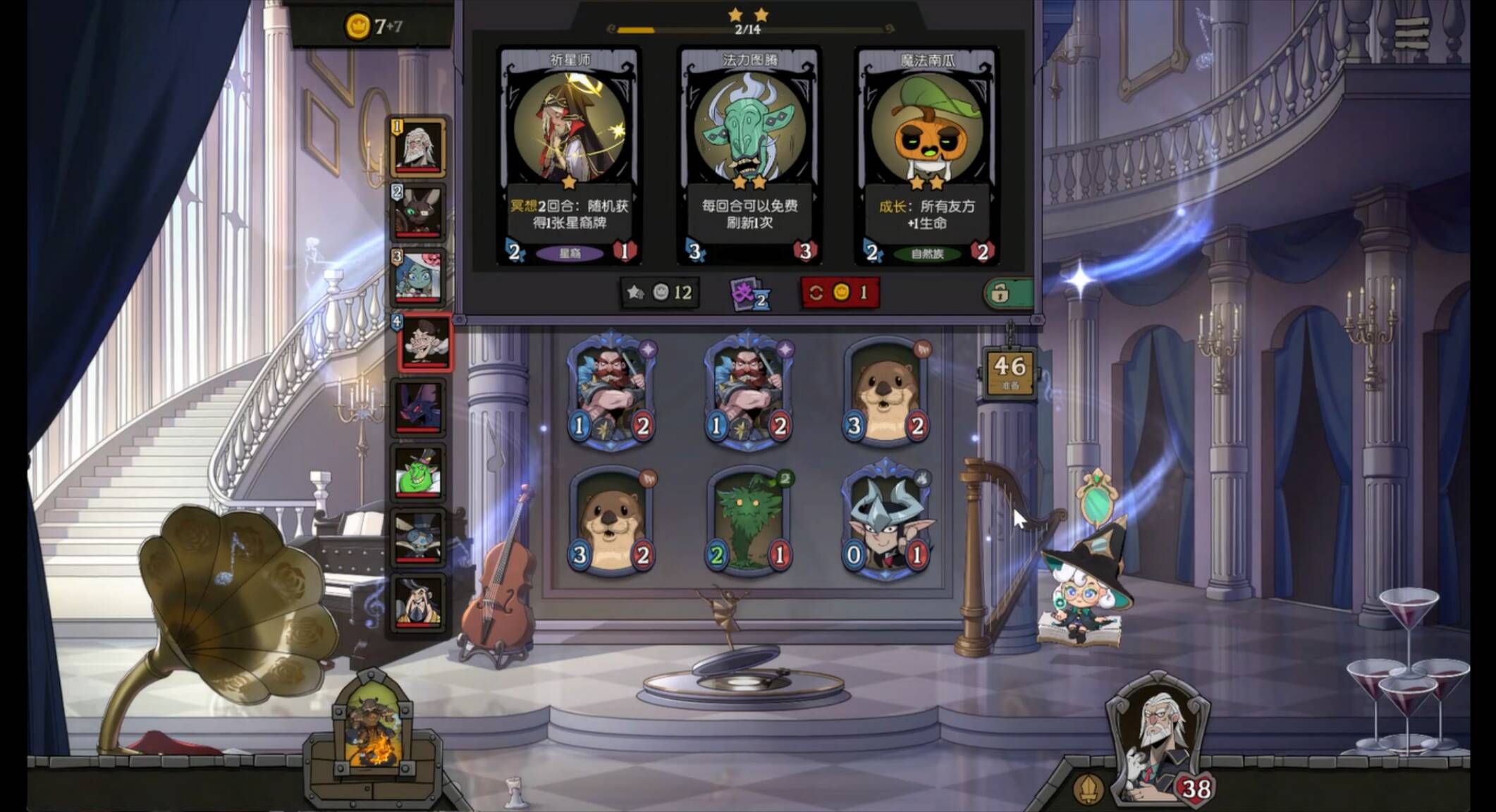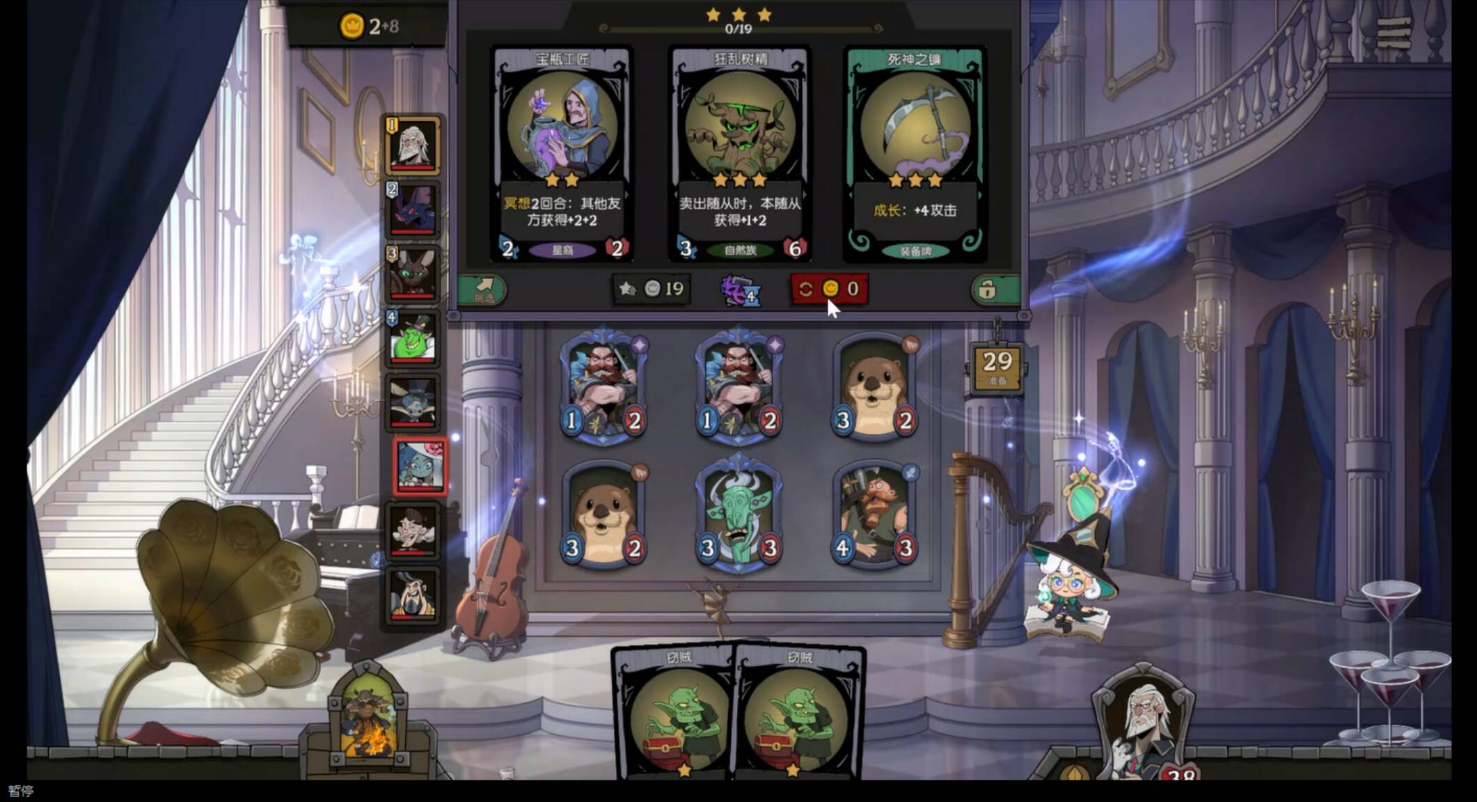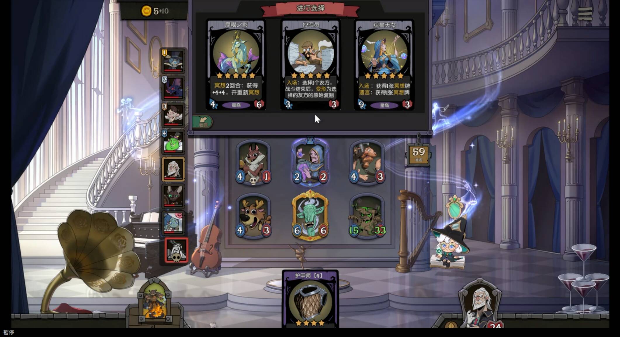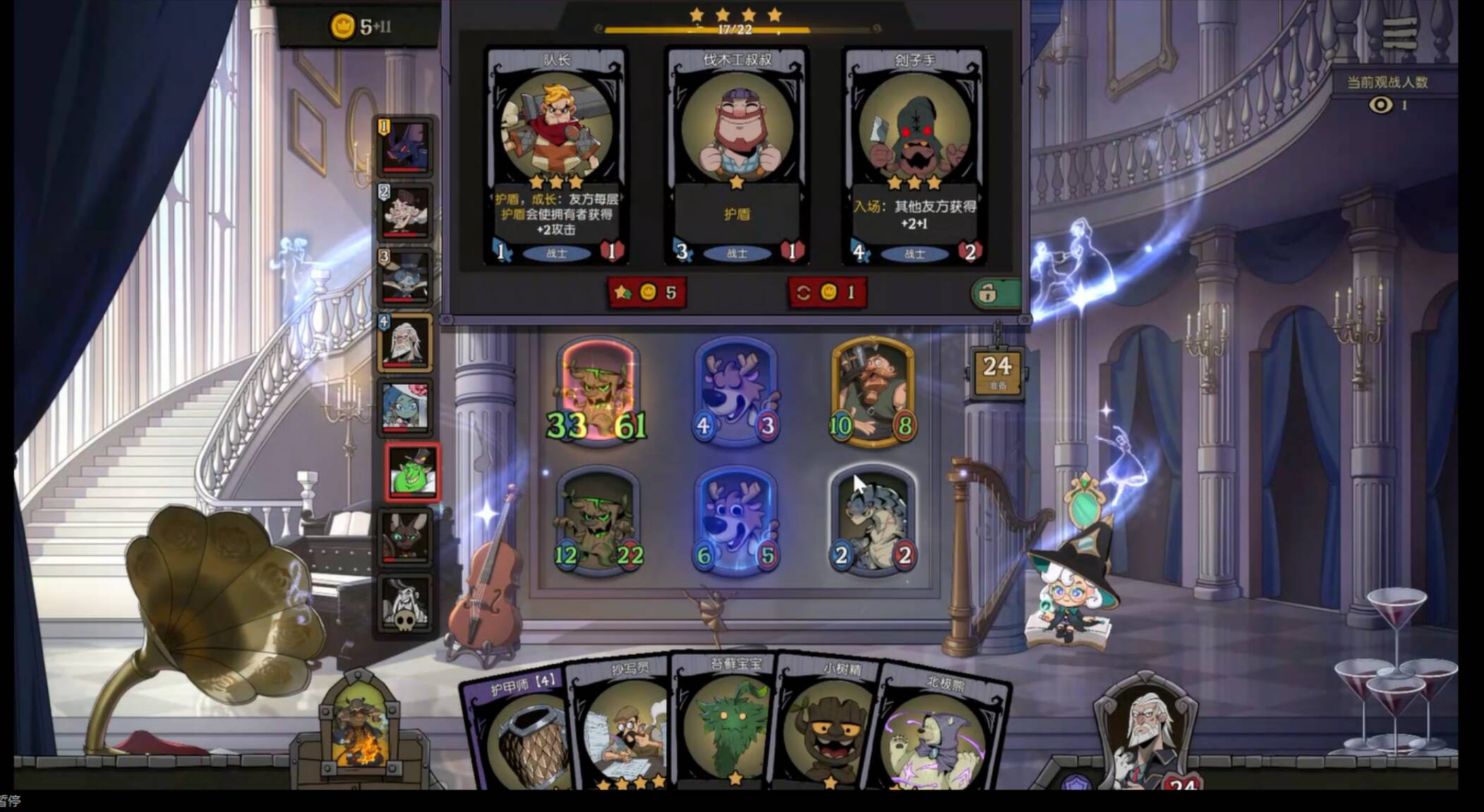 拿下窃贼后直接升本,因为还想将两个1本对子三连,所以直接选择了将小提琴手卖掉,看有无量产工厂,但是无巧不成书,直接来了邀舞,我们直接提前舞伴进行免费刷新,刷到了狂乱树精,那前期的血量无忧,直接可以一直刷新,无脑买卖了(再次强调,有一些咒术可以不着急选,等刷新到有需要的时候,或者节奏需要升本经验,再进行选择,这里就可以选择点金一本窃贼拿下树精从而省钱)继续刷新,小鹿也来啦,我们的配件就差一个林地看守了。