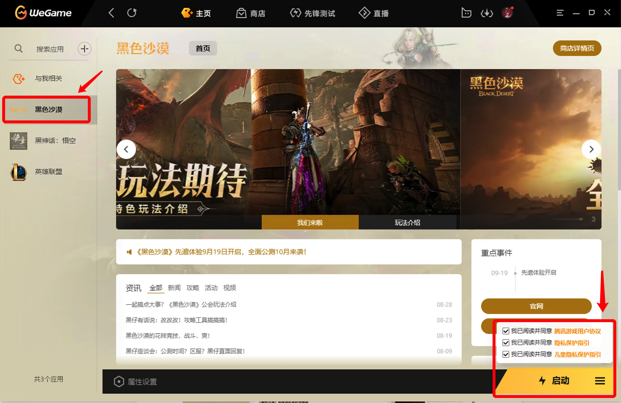 后续再次体验游戏时,均需要先打开WeGame(使用已开通资格的WeGame账号),再进入《黑色沙漠》,点击启动,即可进入游戏。