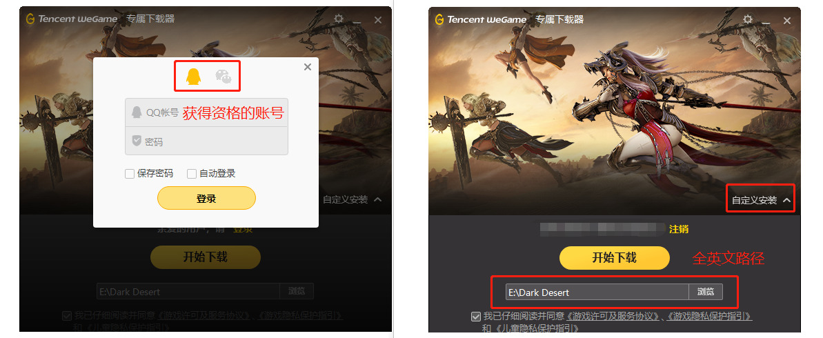 第三步:登录已开通资格的账号,点击开始下载,选择自定义安装调整安装位置(安装至纯英文路径,磁盘名也需要英文)。注意,微信与QQ为两个账号,资格不共享。