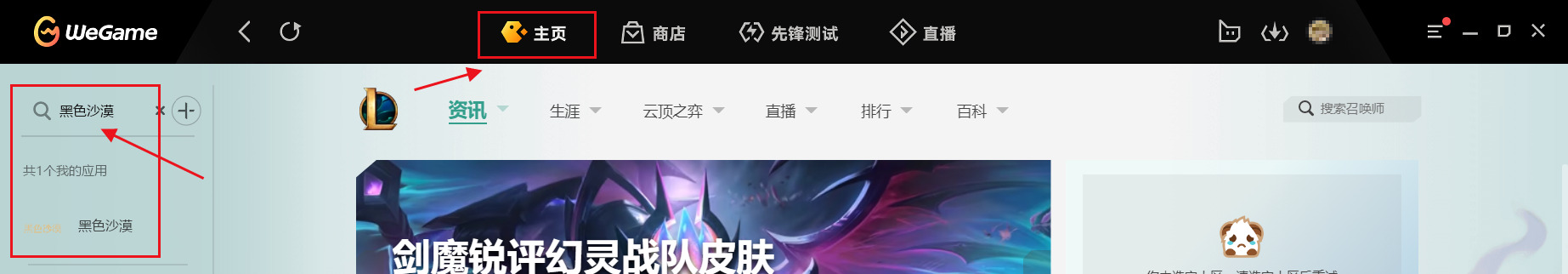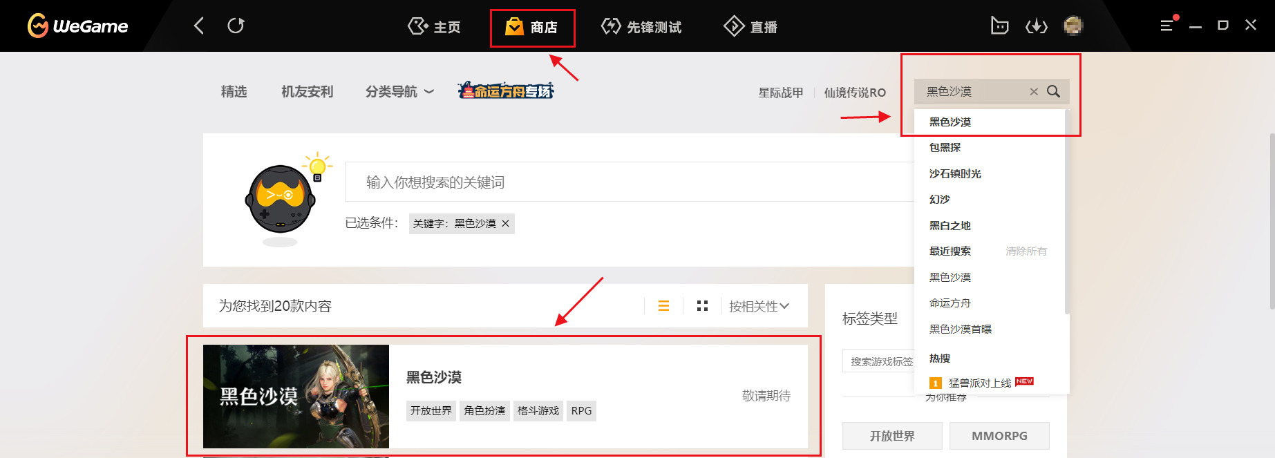 第五步:如果WeGame页面没有《黑色沙漠》游戏,则点击“商店”搜索“黑色沙漠”;或点击“主页”搜索“黑色沙漠”,点击第一个搜索结果进入商店页面。